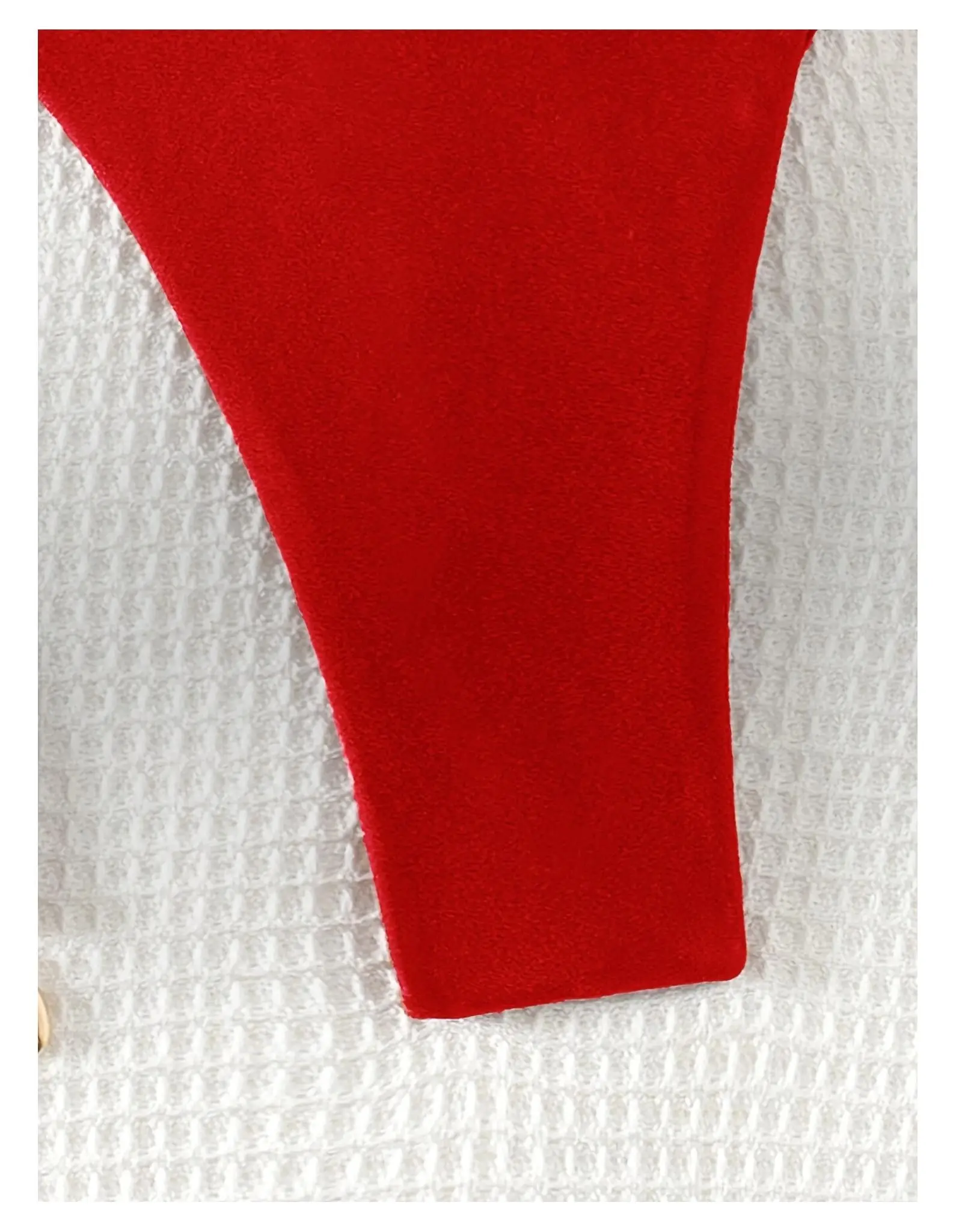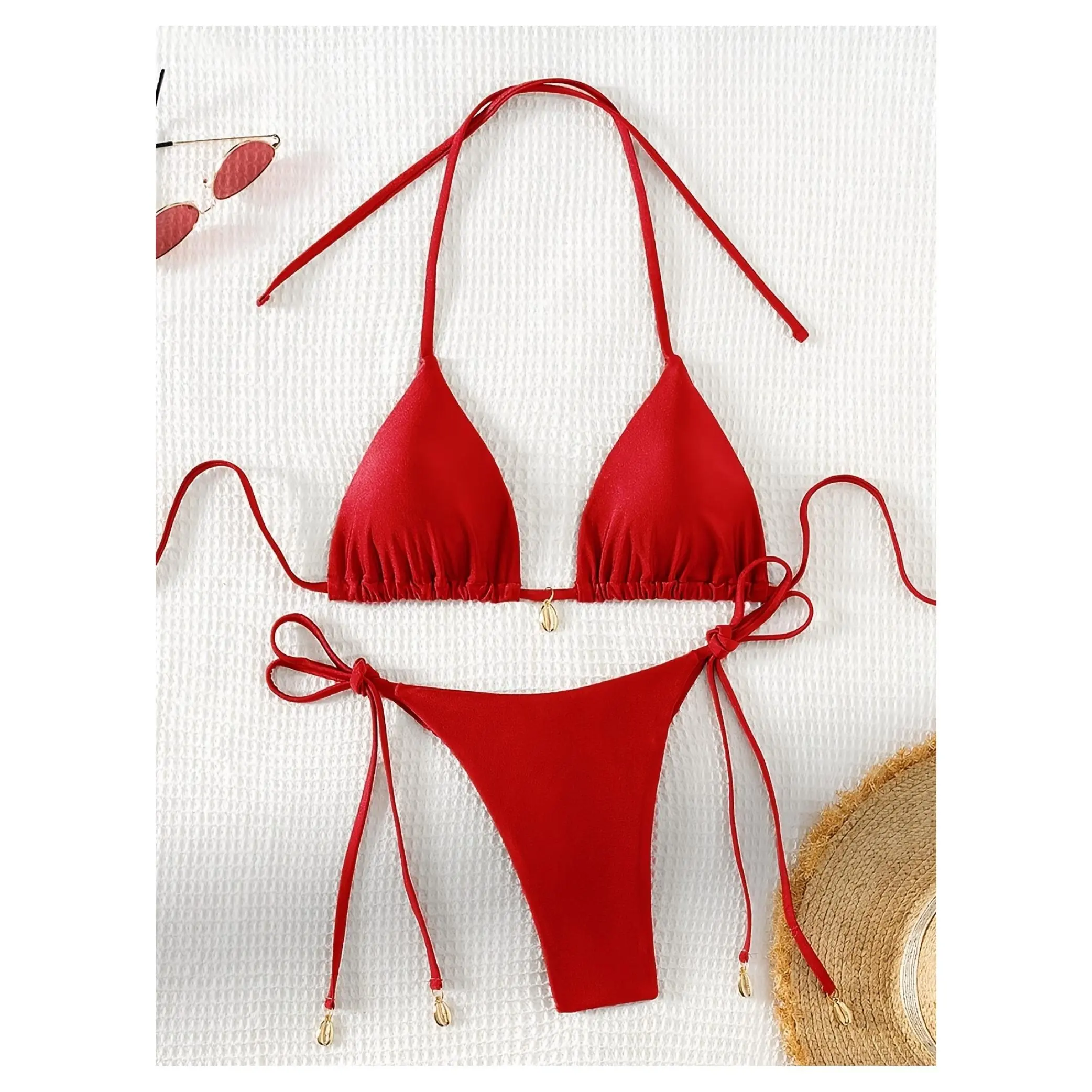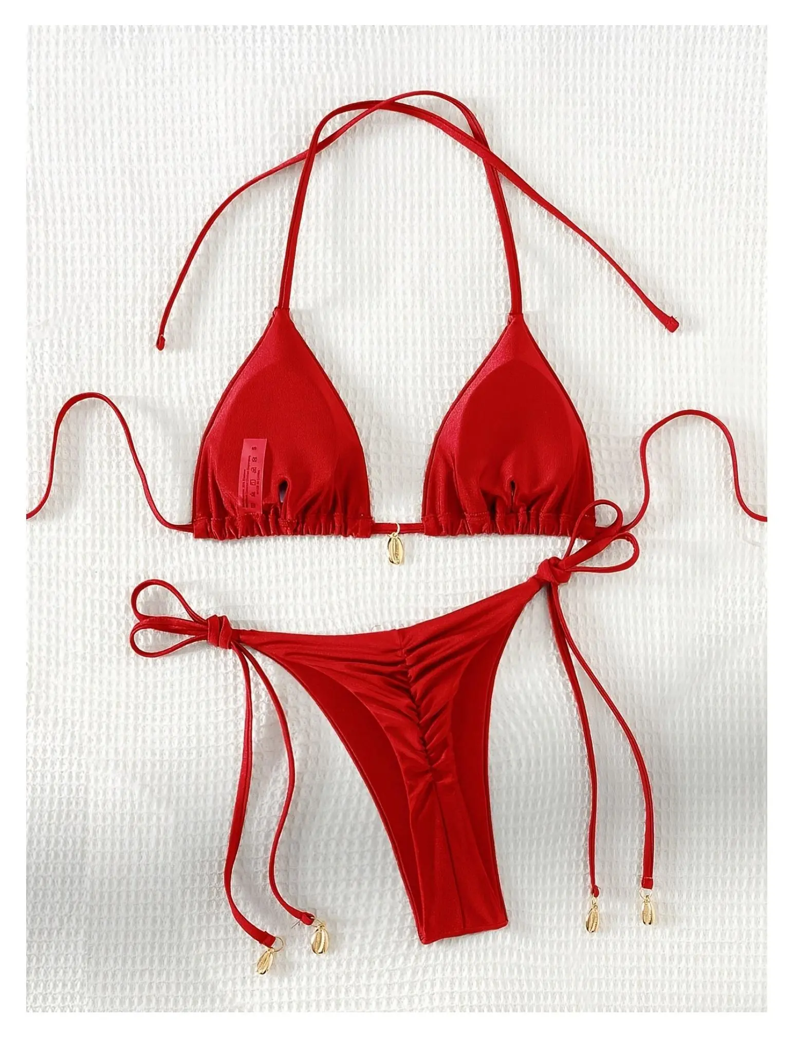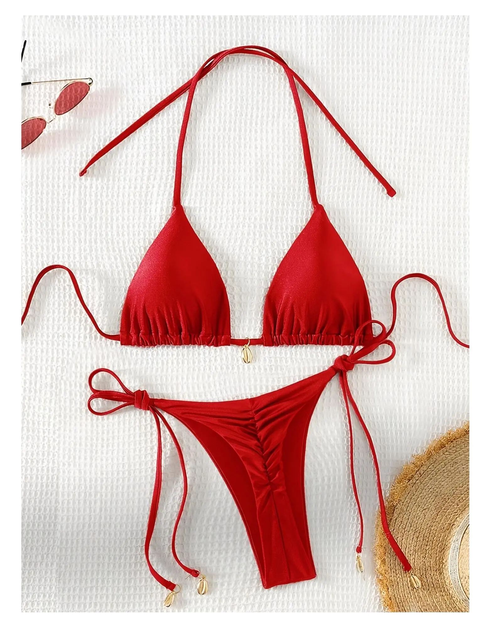 Women's Red Bikini Set - Halter Two Piece Swimsuit, Adjustable Tie Strap Bathing Suit, High Stretch Nylon, Decorative Charms, Beach Pool Summer