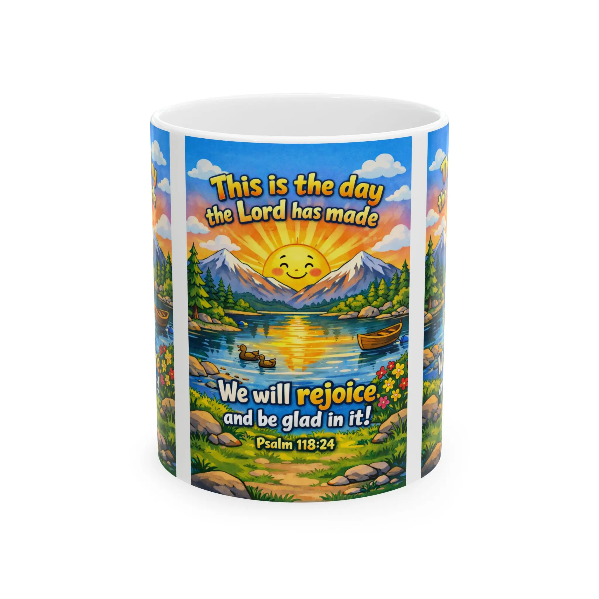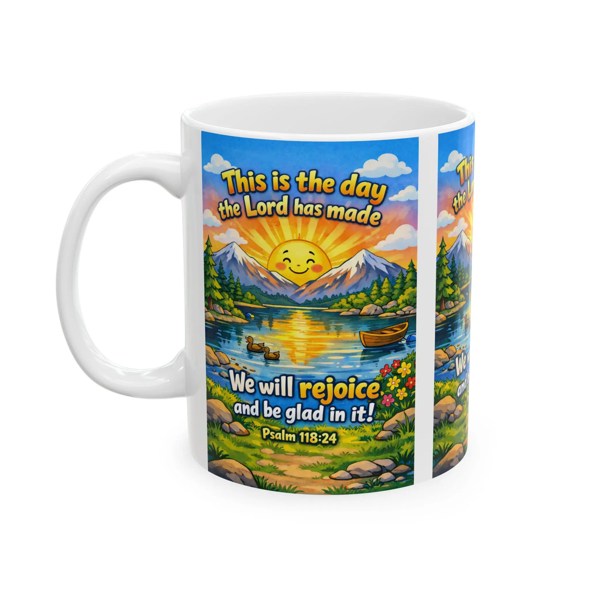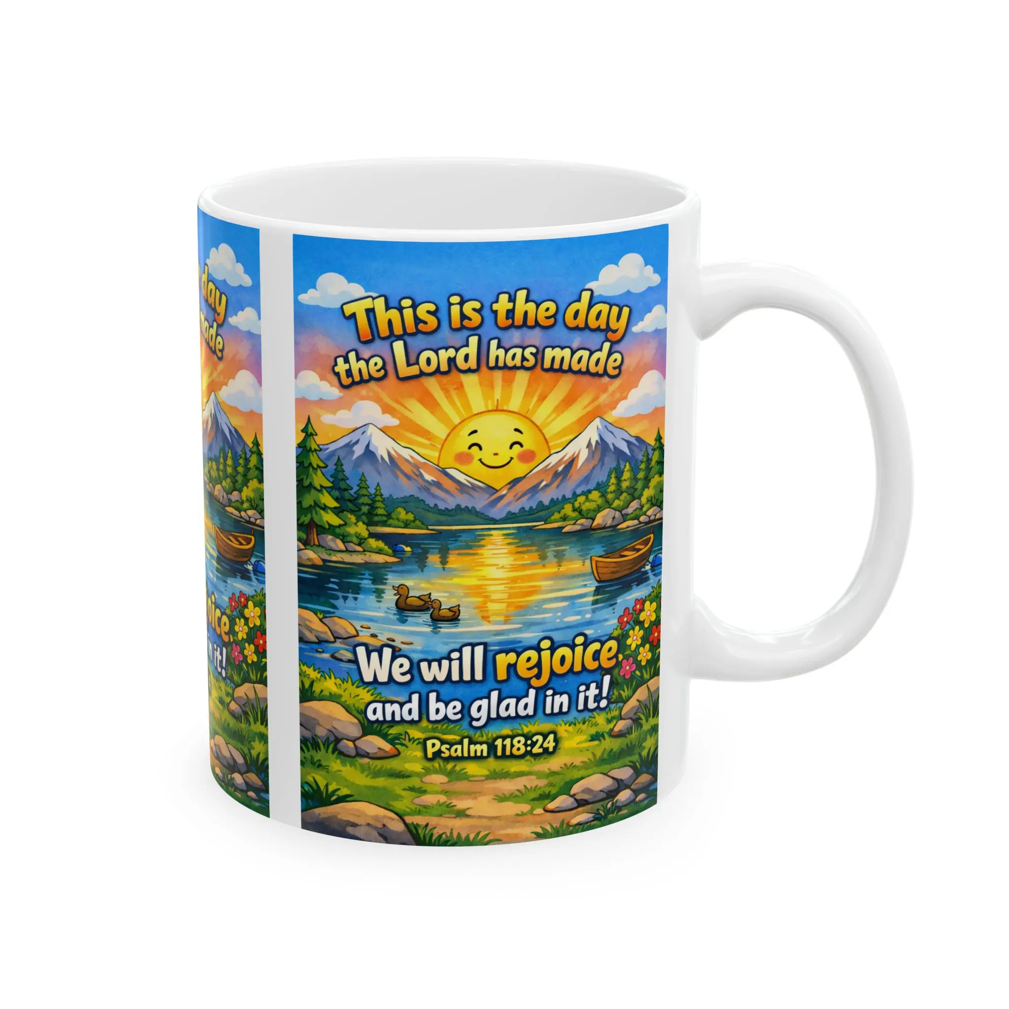 Bright, faith-filled ceramic mug that brings a moment of morning joy. A cheerful sunrise smiles over a peaceful lake, wildflowers, and distant mountains while the verse “This is the day the Lord has made — We will rejoice and be glad in it! (Psalm 118:24)” wraps around the scene. The glossy finish and vibrant printing make the colors sing with every sip.