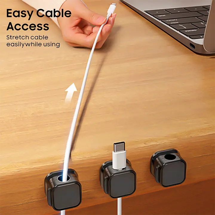It’s more convenient to pull the cables out for smooth use.The strong Pro PET sticky pad provides excellent adhesiveness, avoiding any adhesive residue or surface damage when removed.It sticks firmly to smooth, dry surfaces like wood, tables, glass, or ceramic tiles.