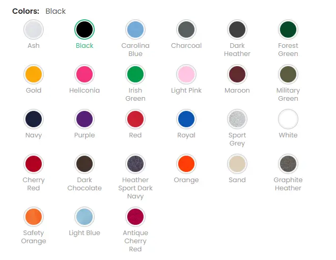 ·Colors: Ash, Black, Carolina Blue, Charcoal, Dark Heather, Forest Green, Gold, Heliconia, Irish Green, Light Blue, Light Pink, Maroon, Military Green, Navy, Purple, Red, Royal, Sport Grey, White, Cherry Red, Dark Chocolate, Heather Sport Dark Navy, Orange, Sand, Graphite Heather, Safety Orange, Navy Heather, Antique Cherry Red.