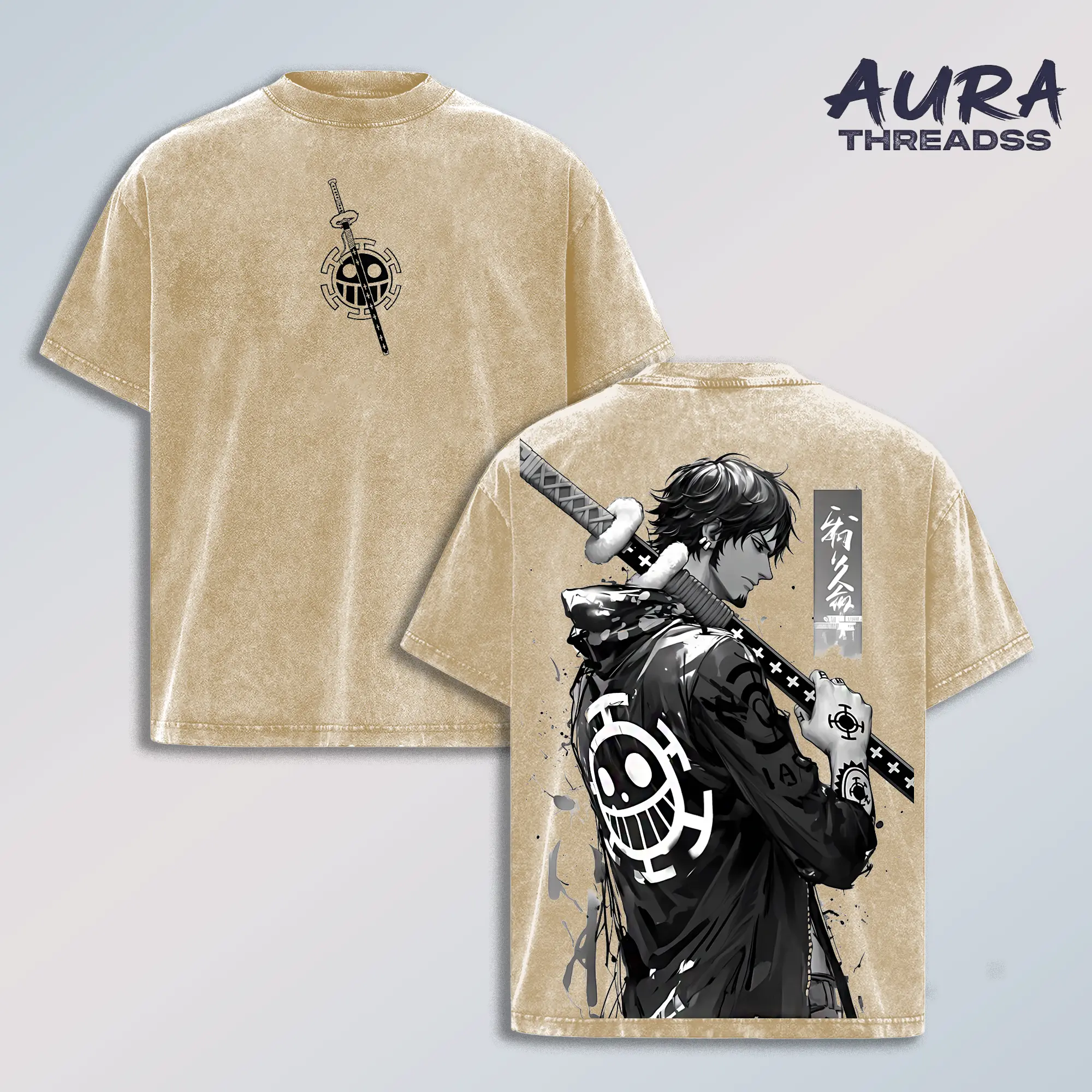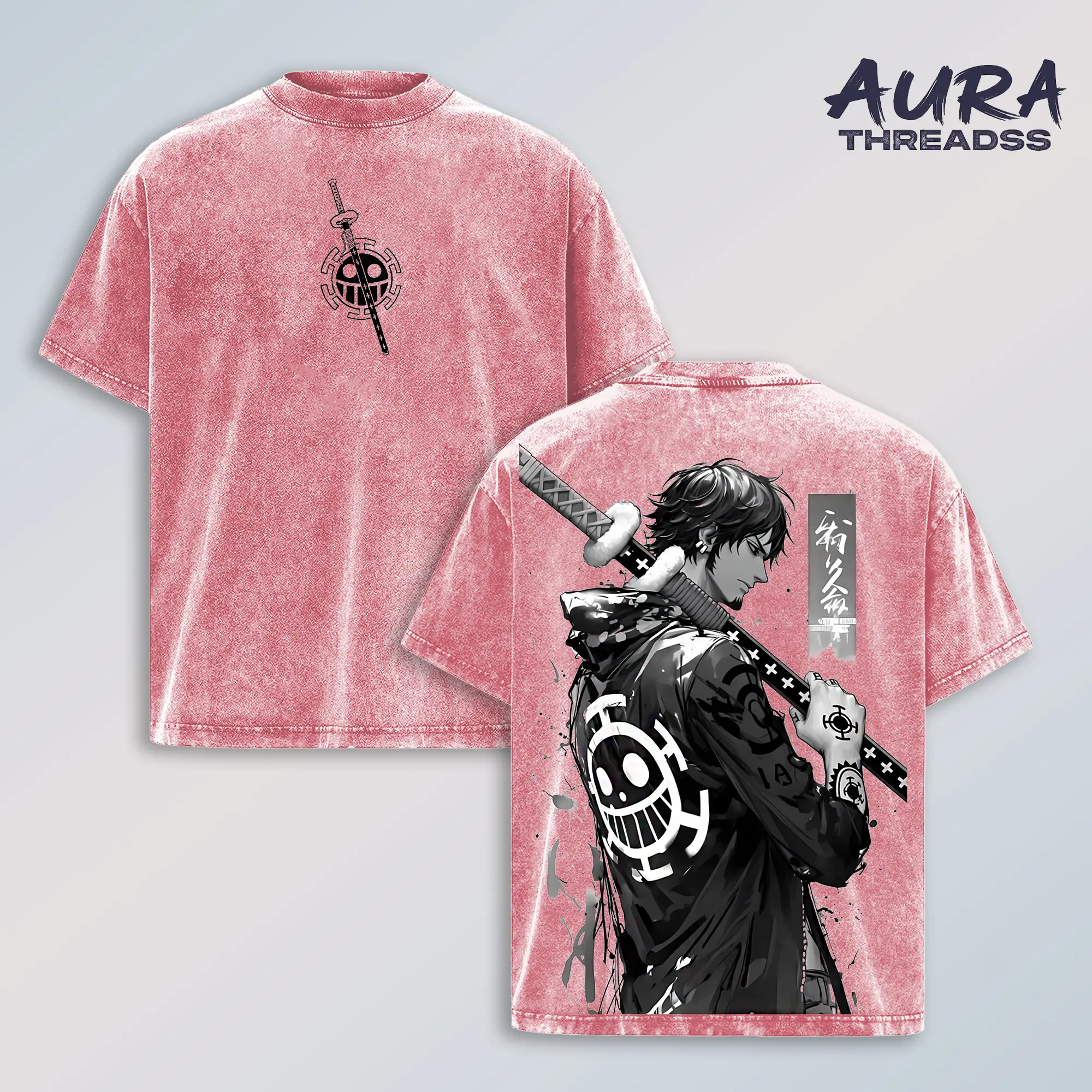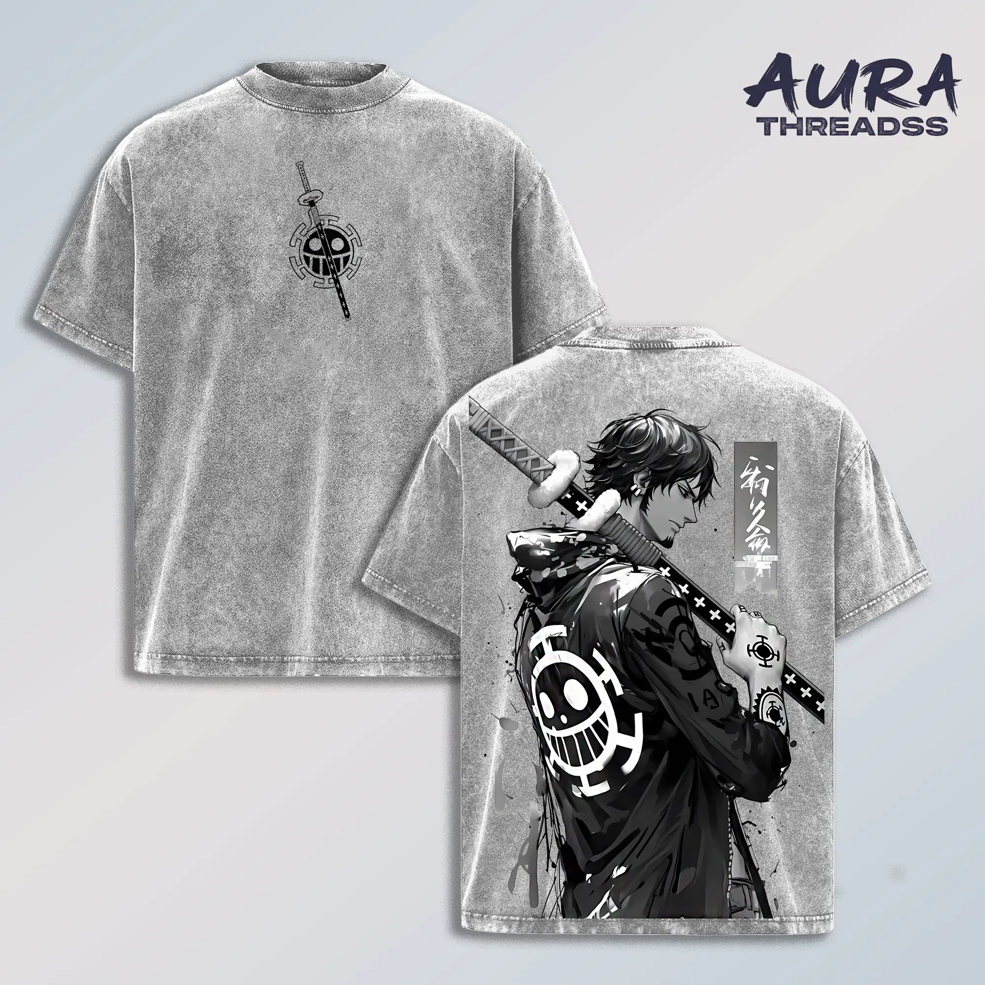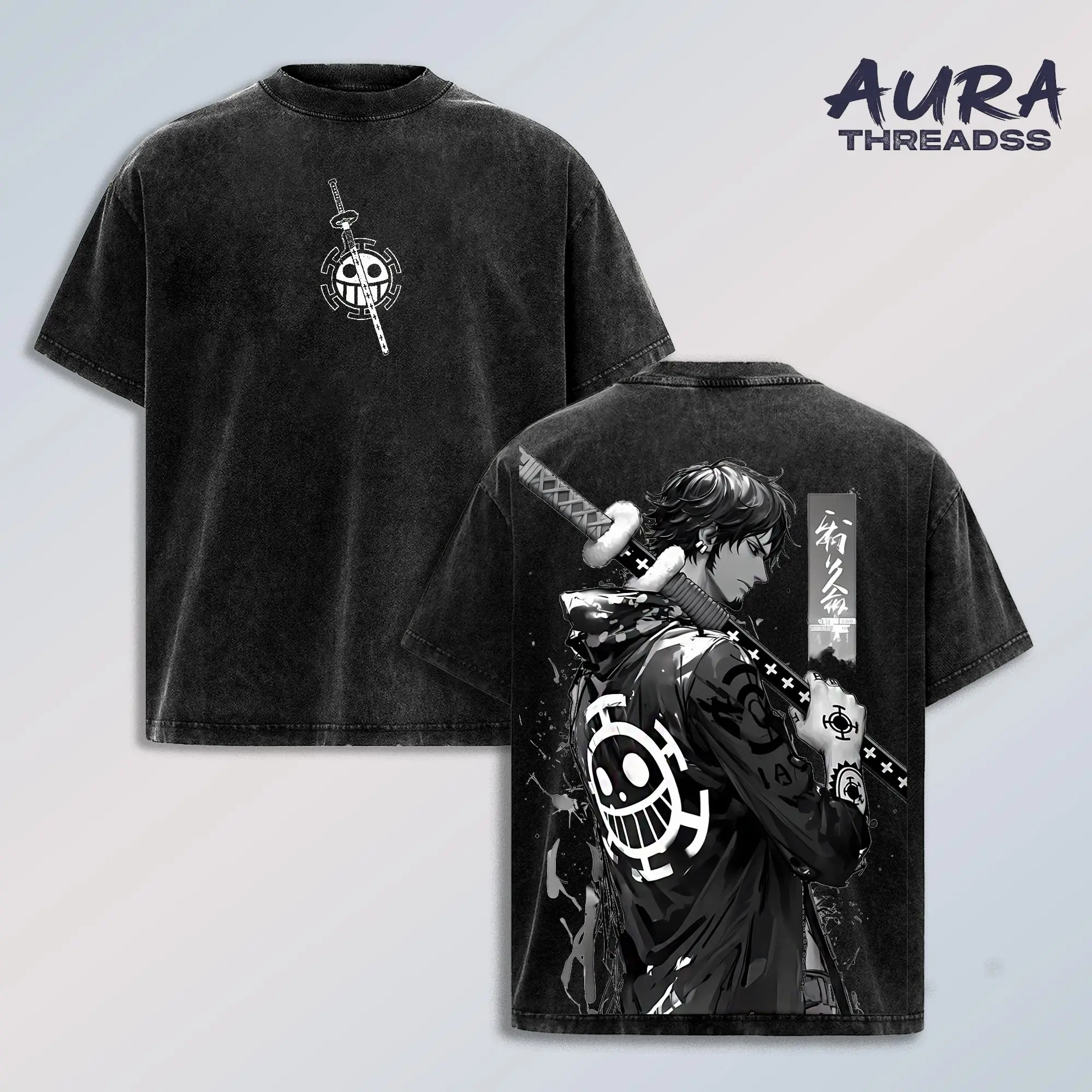 Trafalgar D Water Law OP Shirt, Vintage Washed Anime T-Shirt with Sword Graphic and Heart Pirates Emblem, Oversized Streetwear Tee for Men Women Trendy Urban Style
