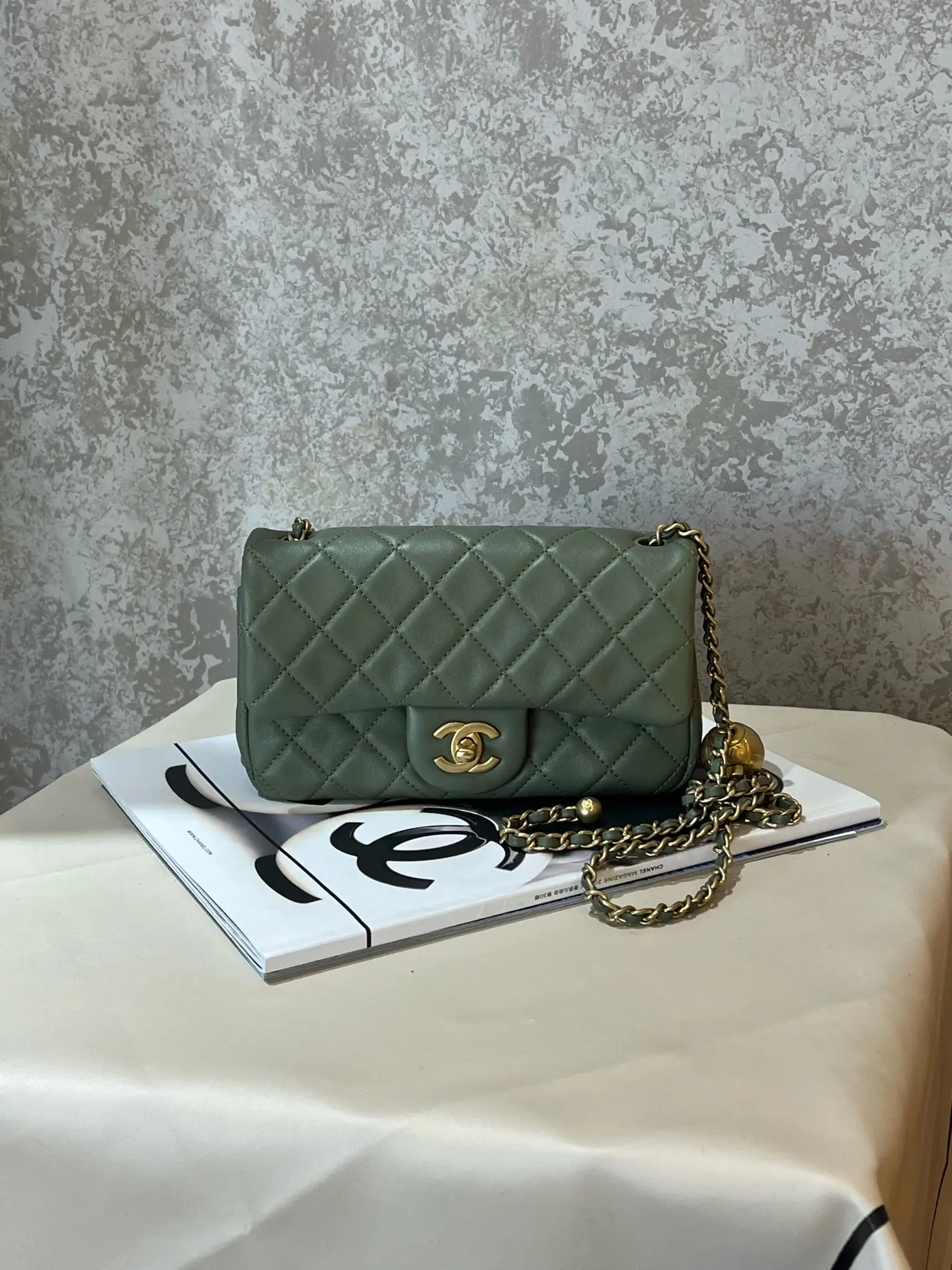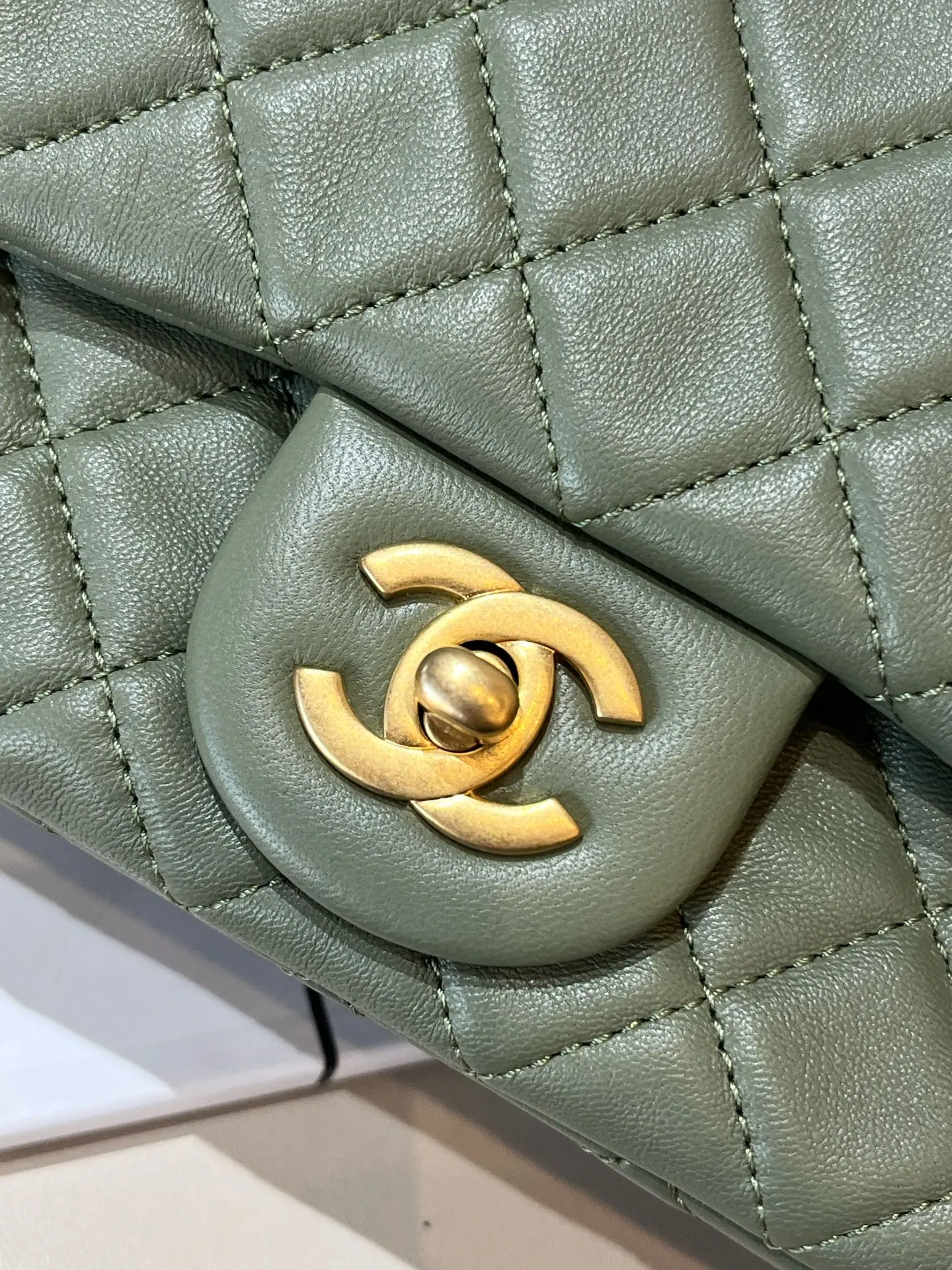 Authentic pre-owned Chanel Mini Rectangular Classic Flap Bag in avocado green lambskin, featuring the iconic adjustable gold ball chain, polished gold-tone CC turnlock, and NFC chip authentication. It's a highly sought-after, versatile luxury staple perfect for everyday wear.