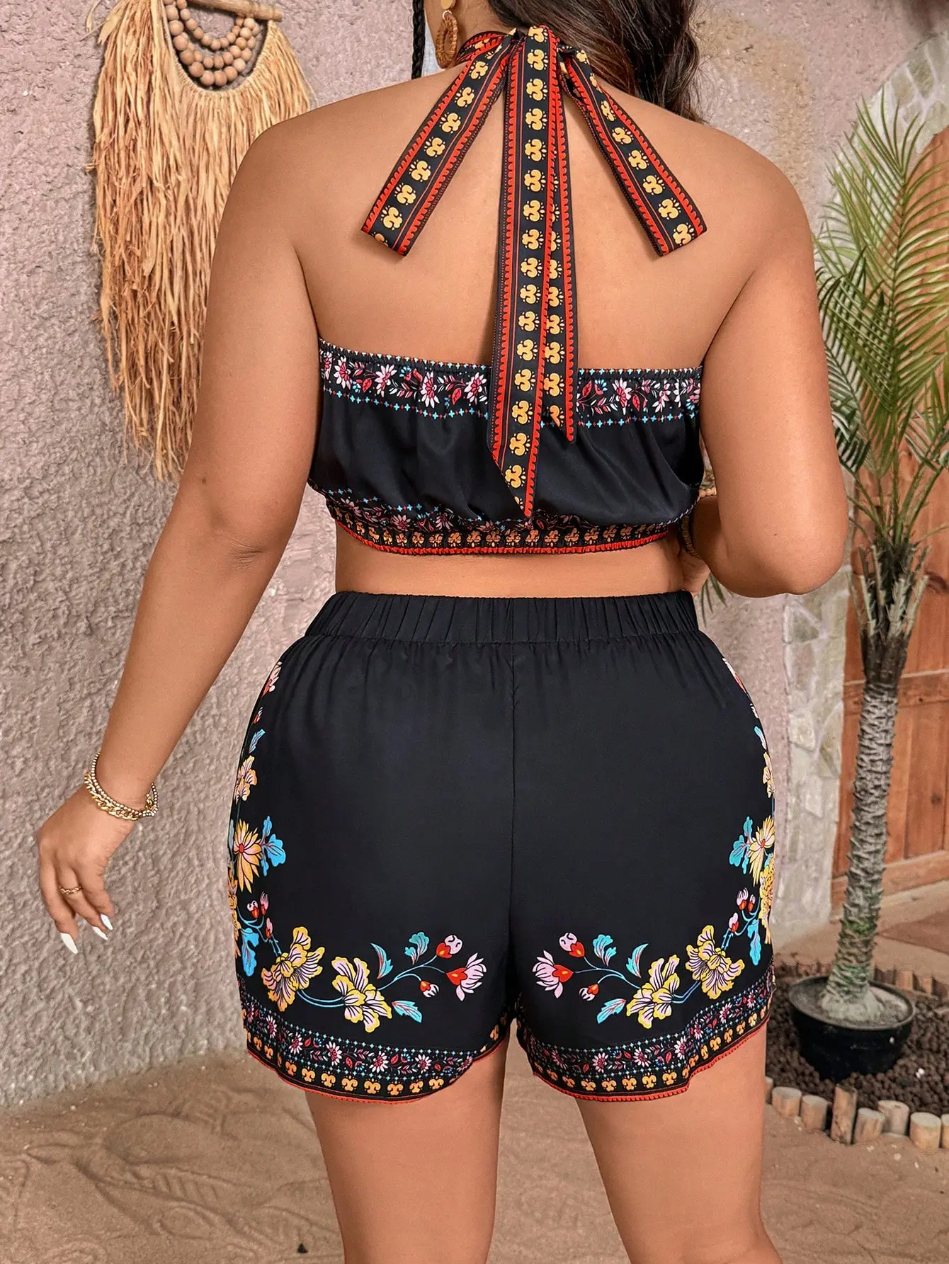 Boho Plus Size Floral Print Halter Cropped Top Side Knot Skort Set Black
