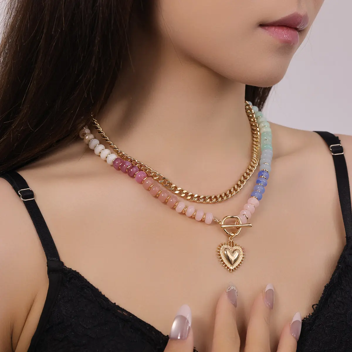 Glamour Dopamine Colorful Beaded Necklace Ethnic-Style Collarbone Chain with Stackable Heart Pendant for Stylish Looks and Versatile Jewelry