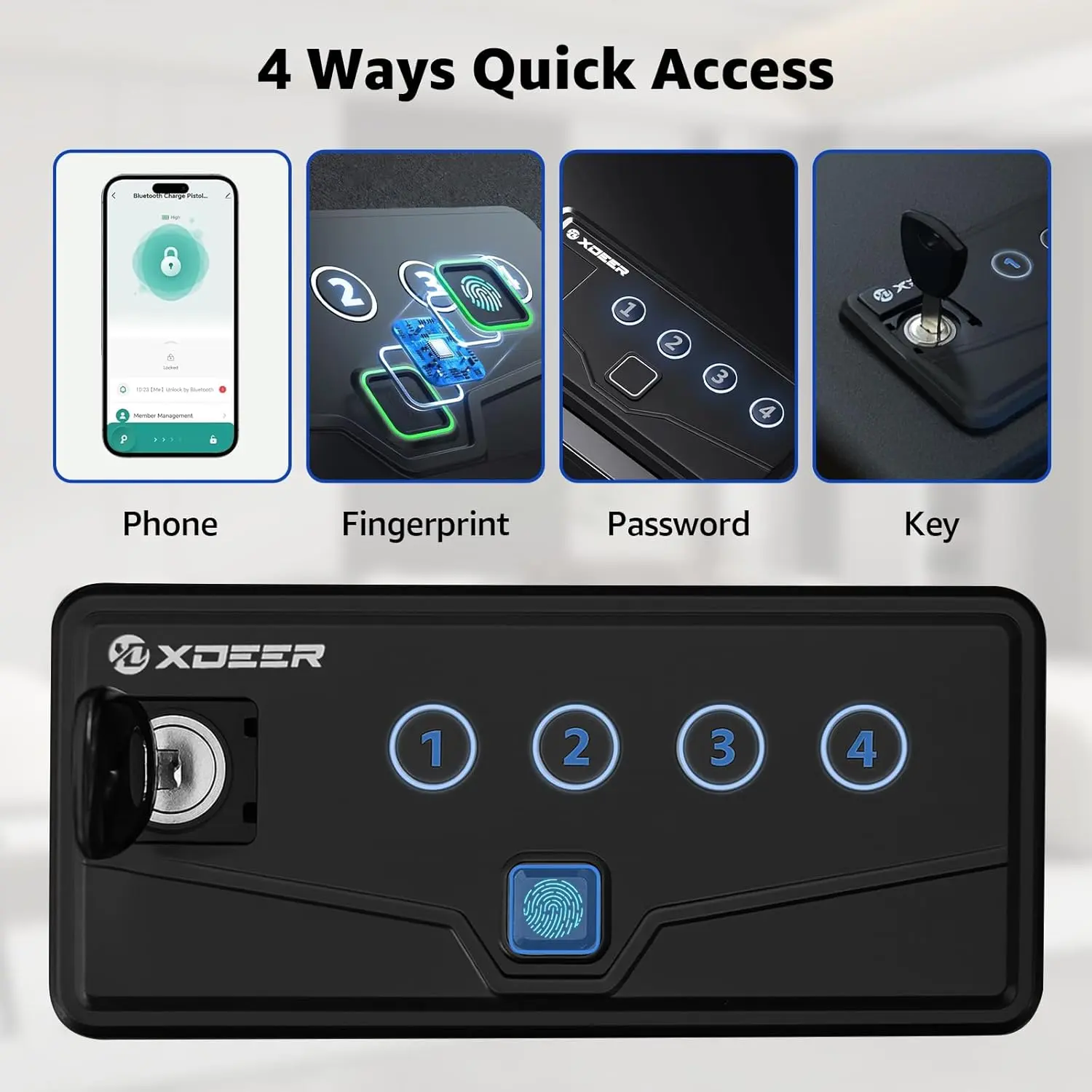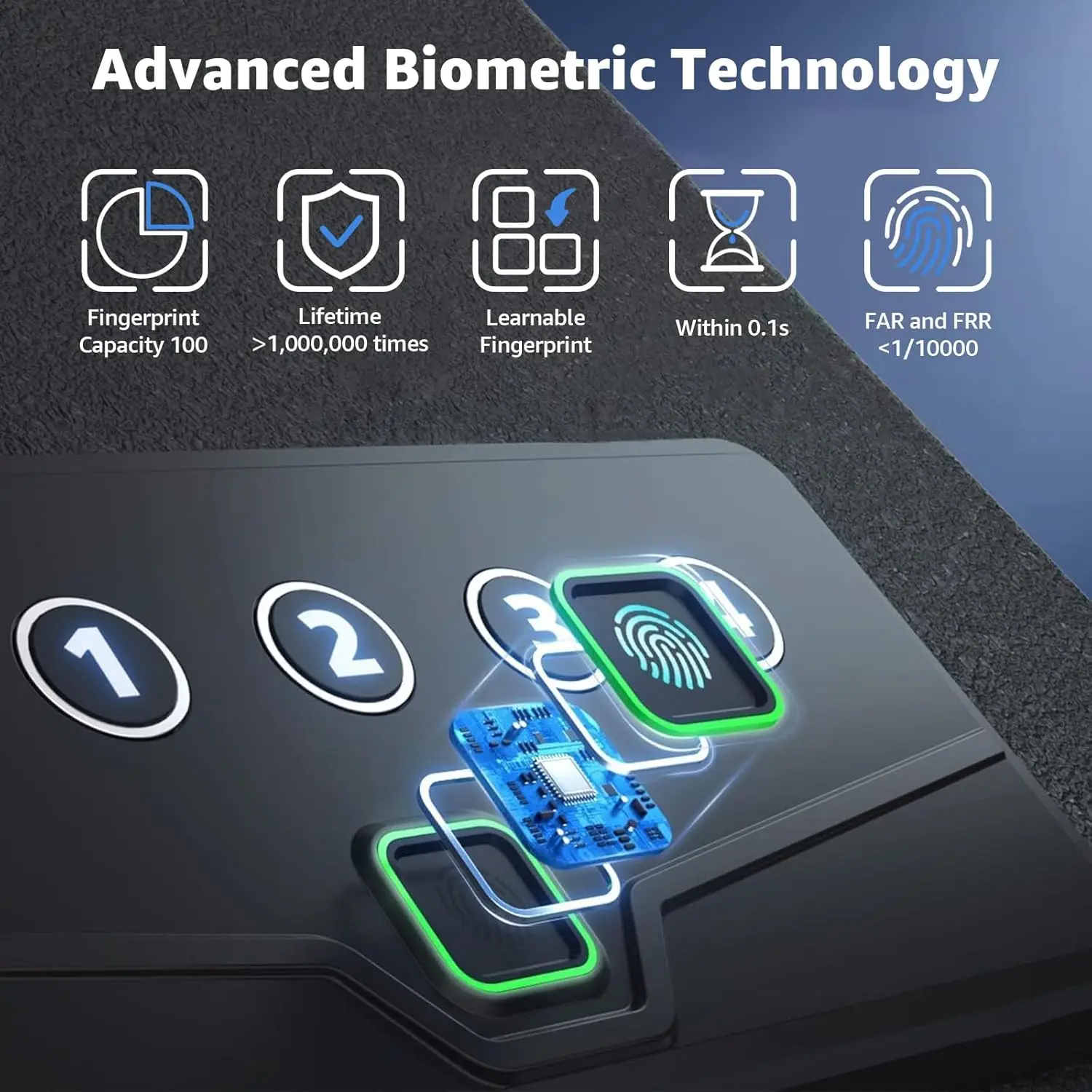 ·4-in-1 Fast Unlocking Ways: This biometric gun safe for pistol let you enjoy 0.1s high-precision biometric fingerprint recognition, a customizable 3-8 digit keypad password, 2 backup keys, and smartphone Bluetooth unlock for flexible, instant firearm access.30 fingerprint capacity and 100000 times fingerprint unlocks.Password errors exceeding 5 times will trigger an alarm and enter a 3-minute freeze.