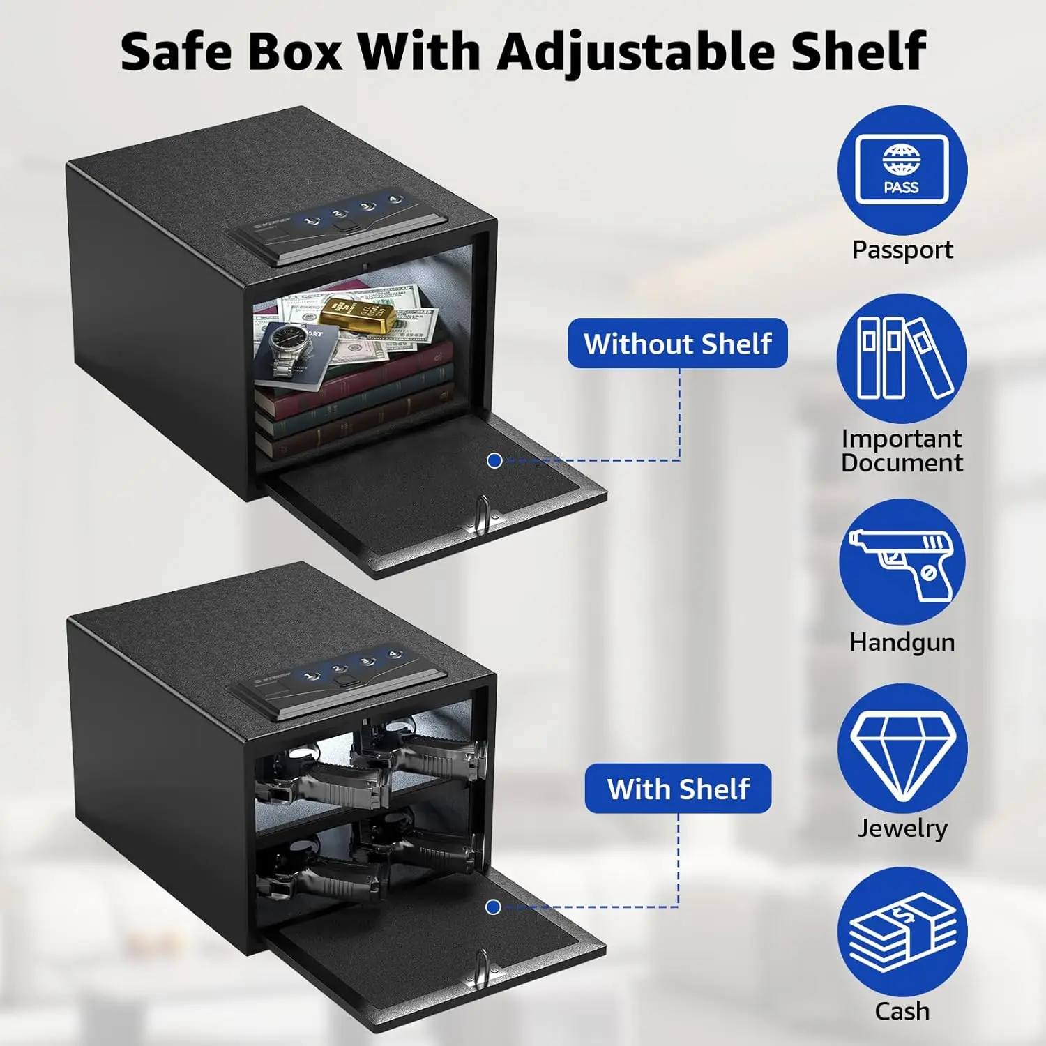 ·Built-in LED Lighting & Anti-Theft Design: Internal LED light illuminates the interior for easy visibility, even if you open it at night, you can quickly get your convenience; includes a steel security cable to anchor the safe and prevent unauthorized removal.When a thief cannot open your safe, they may carry it away, and anti-theft steel cables can prevent this from happening.