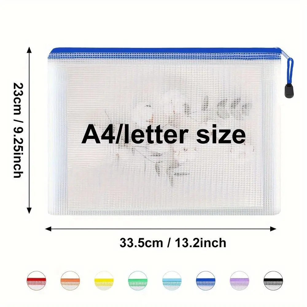 A4 Paper Mesh Zipper Pouch, 8 Counts/set Waterproof Zipper File Paper Stationery Bag, File Storage Bag for School Office Dormitory Home Outdoor, Paper Organizers