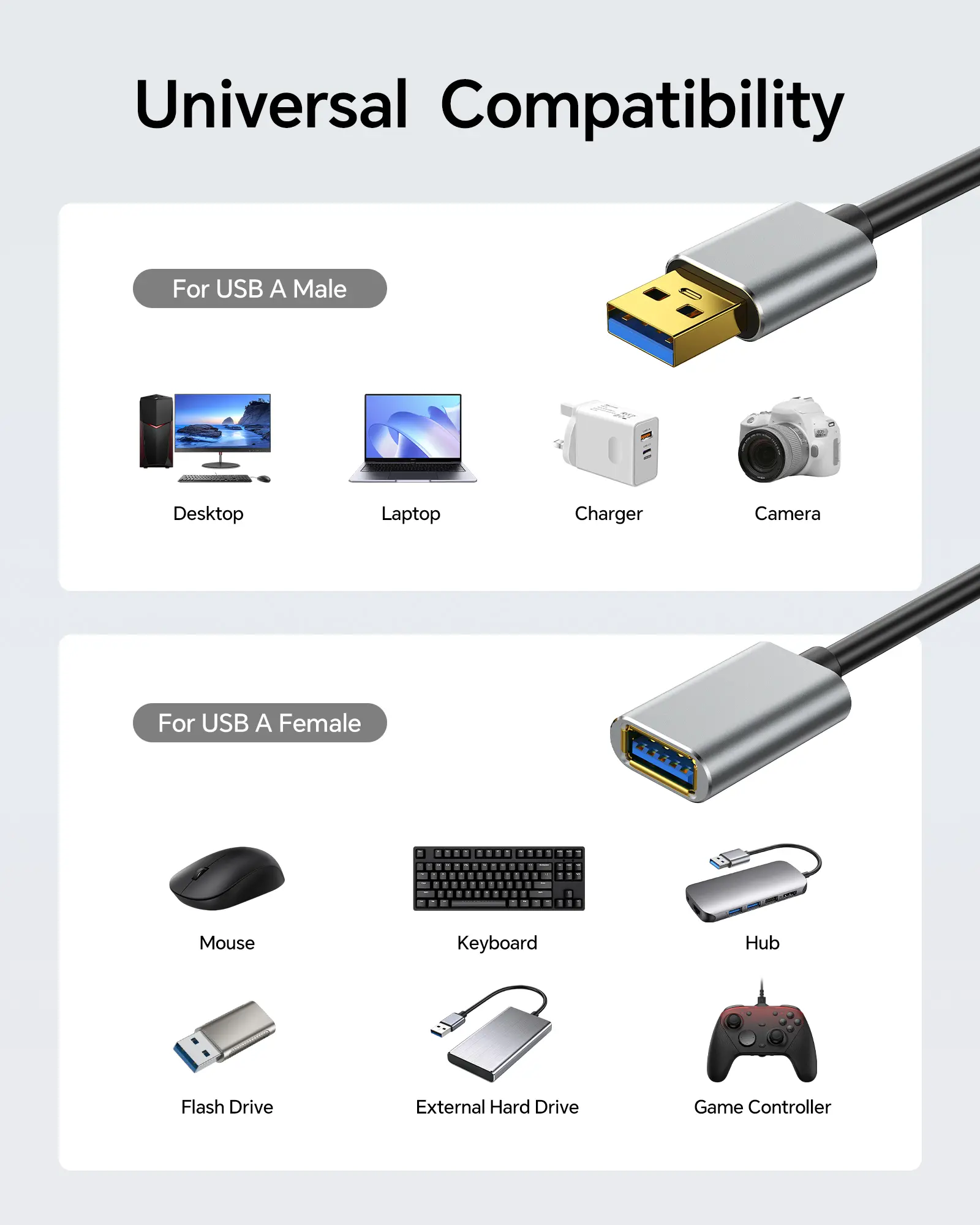 ·MULTIPLE LENGTH OPTIONS FOR DIFFERENT SETUPS: Available in 1.6ft, 3.3ft, 6.6ft, 10ft, and 16ft to accommodate various desktop, home, and gaming configurations. Shorter USB extenders are perfect for compact workspaces and laptop port protection, while longer extension cords provide extended reach for Smart TVs, gaming consoles, and hard-to-access USB ports