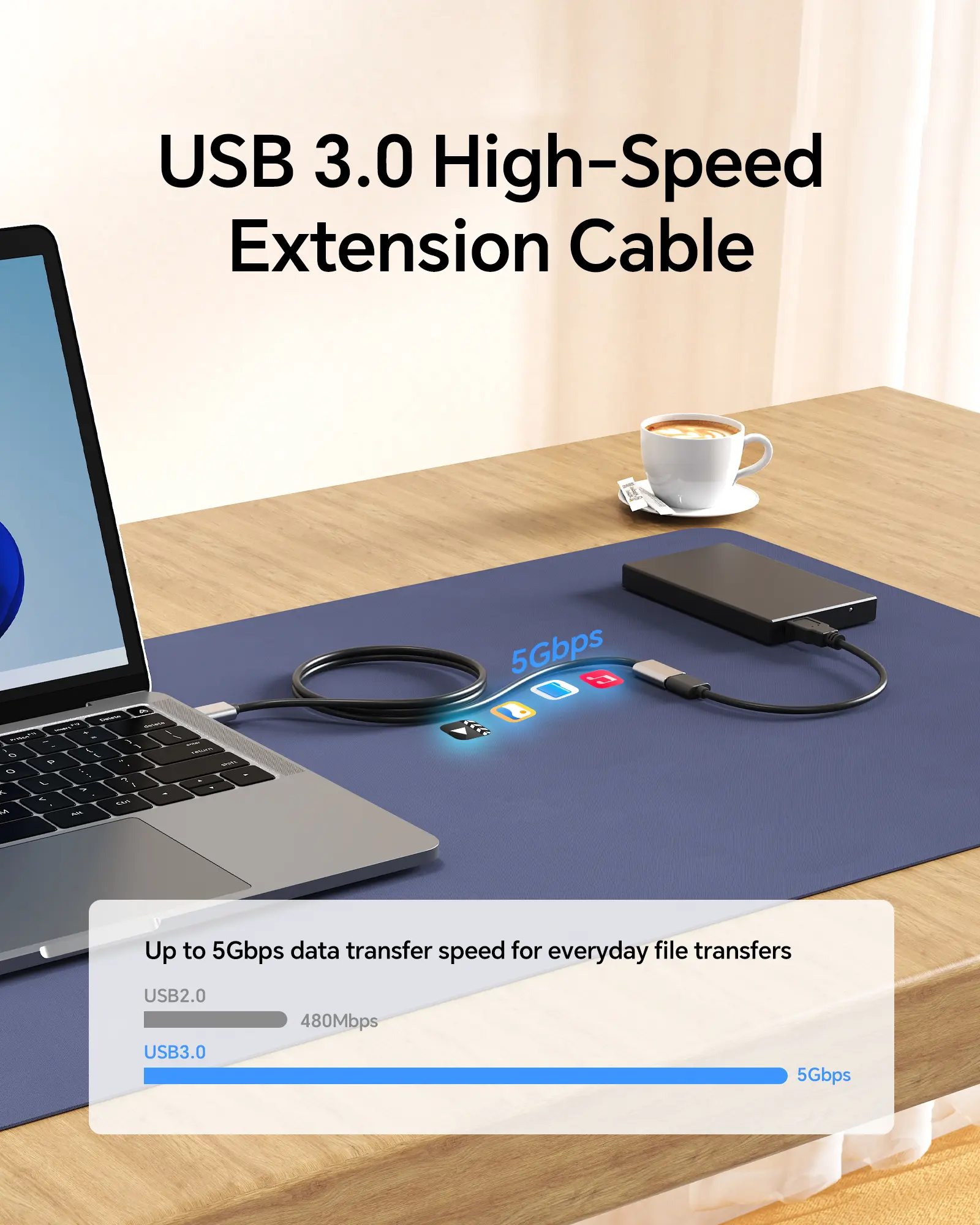 ·5GBPS SUPERSPEED DATA SYNC & TRANSFER: Supports USB 3.0 data transfer speeds up to 5Gbps, 10x faster than USB 2.0 for efficient file syncing and data transmission. This high-speed USB extension cable is perfect for external hard drives, SSDs, and USB flash drives.