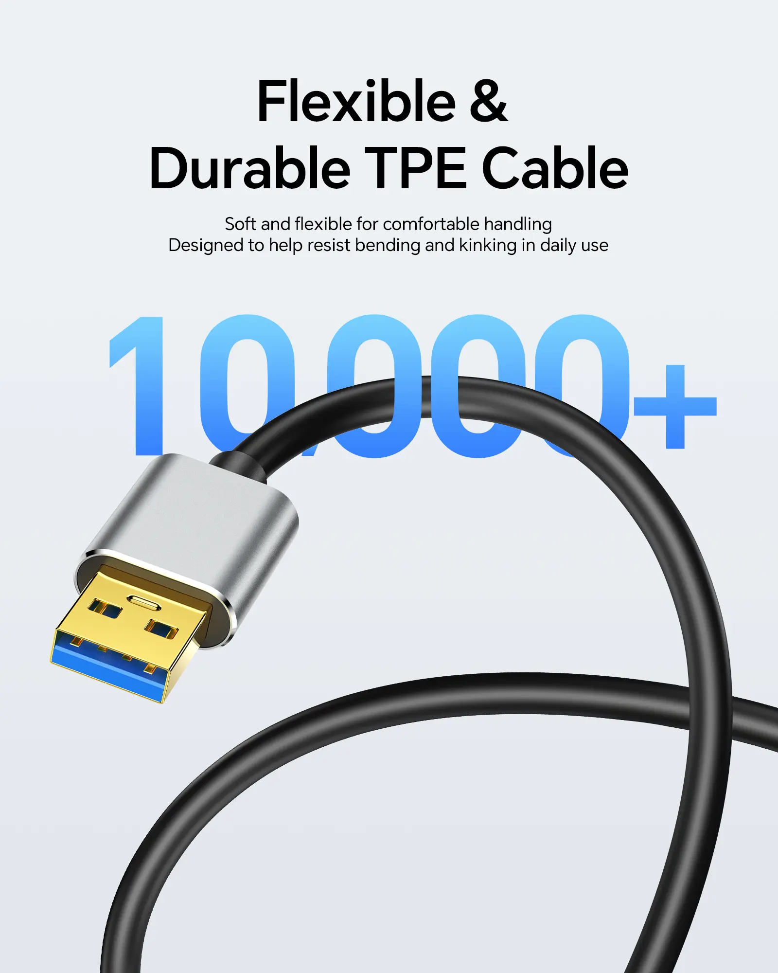 ·DURABLE AND FLEXIBLE PREMIUM TPE JACKET: Constructed with upgraded premium TPE material that offers superior flexibility and resistance to bending. This USB male to female cable is tested for 10,000+ bend cycles to ensure long-term heavy-duty use and a tangle-free experience, making it more resilient than standard PVC cables.