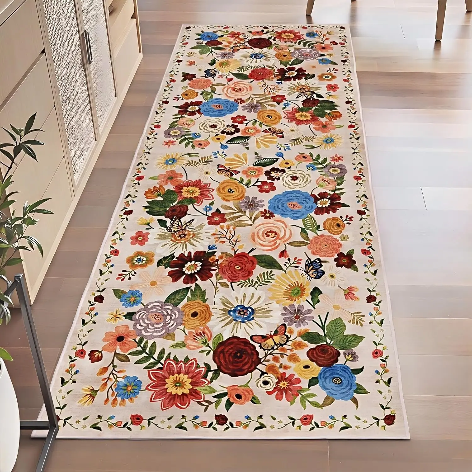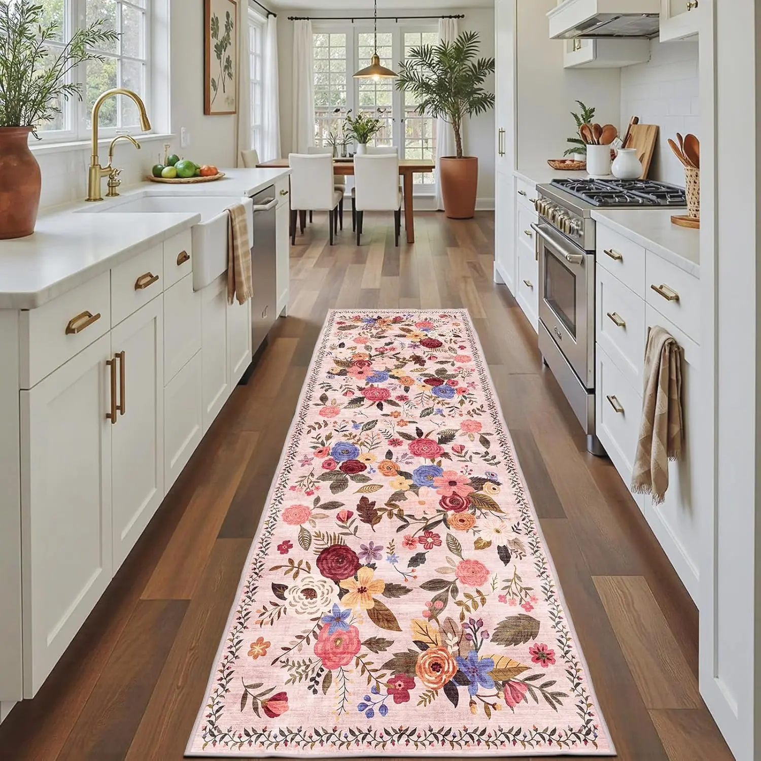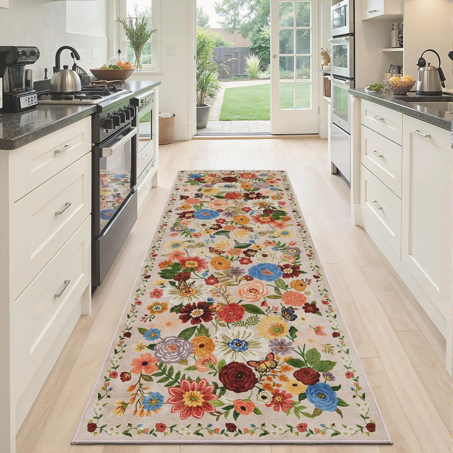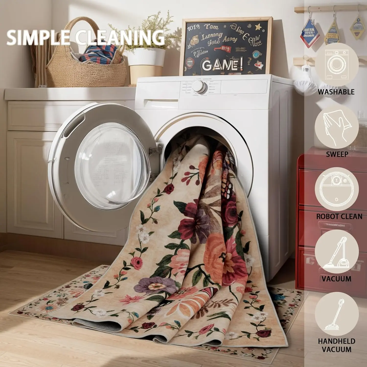 Non-Slip 2x6 Runner Rug Beige – Durable rubber backing keeps it secure on hardwood, tile, or laminate floors. Perfect for hallways, kitchens, or entryways. Soft Floral Design – Subtle vintage-inspired patterns complement farmhouse, modern, or boho decor. Low-pile for gentle comfort. While adding a touch of charm to your home, its soft texture helps relieve soreness from prolonged standing. Machine-Washable & Stain-Resistant – Easy to clean in standard washing machines, stays vibrant and fade-free for years. Kids & Pets Friendly Multi-Room Versatility – Ideal for high-traffic areas like hallways, kitchens, laundry rooms, or bedrooms. Stylish and practical. Reinforced Edges for Durability – Tightly woven construction resists fraying, perfect for homes with pets, kids, or daily use. Tips1: The color of the product may vary slightly due to monitor lighting and design requirements, and the actual item shall prevail. Tips2: Folded rugs may have creases when they arrive. Roll out the rug and allow time to flatten and settle.When vacuum, use soft roller cleaner head/ dusting brush only and vacuum on the lowest setting. Machine wash gently in cold water and never bleach. Air dry or dry on air-only cycle without heat.