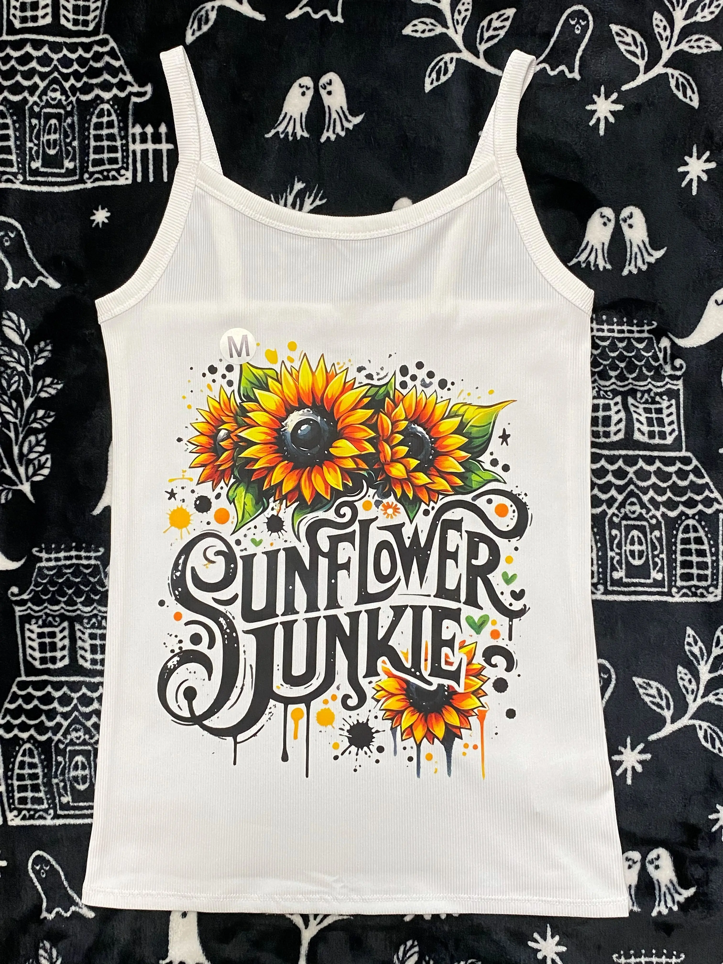 size medium white buttery tank top with sunflower junkie graphics.