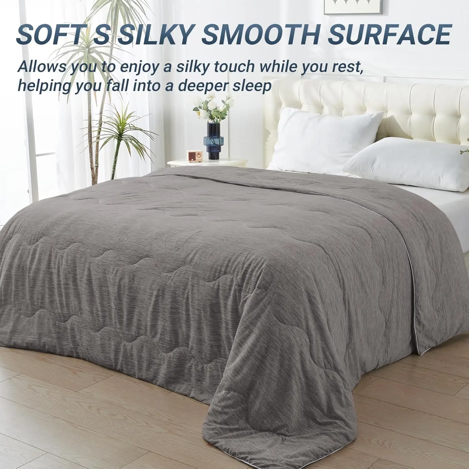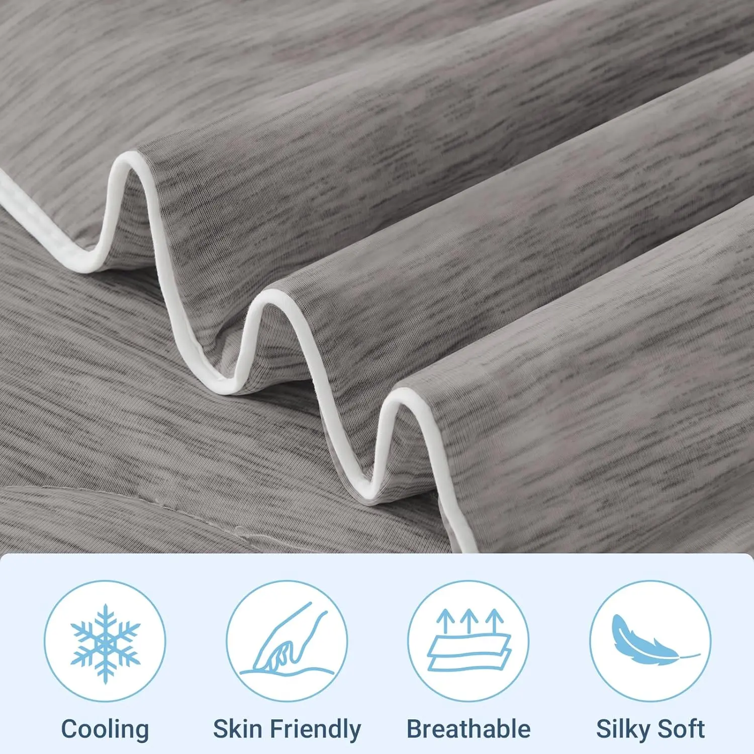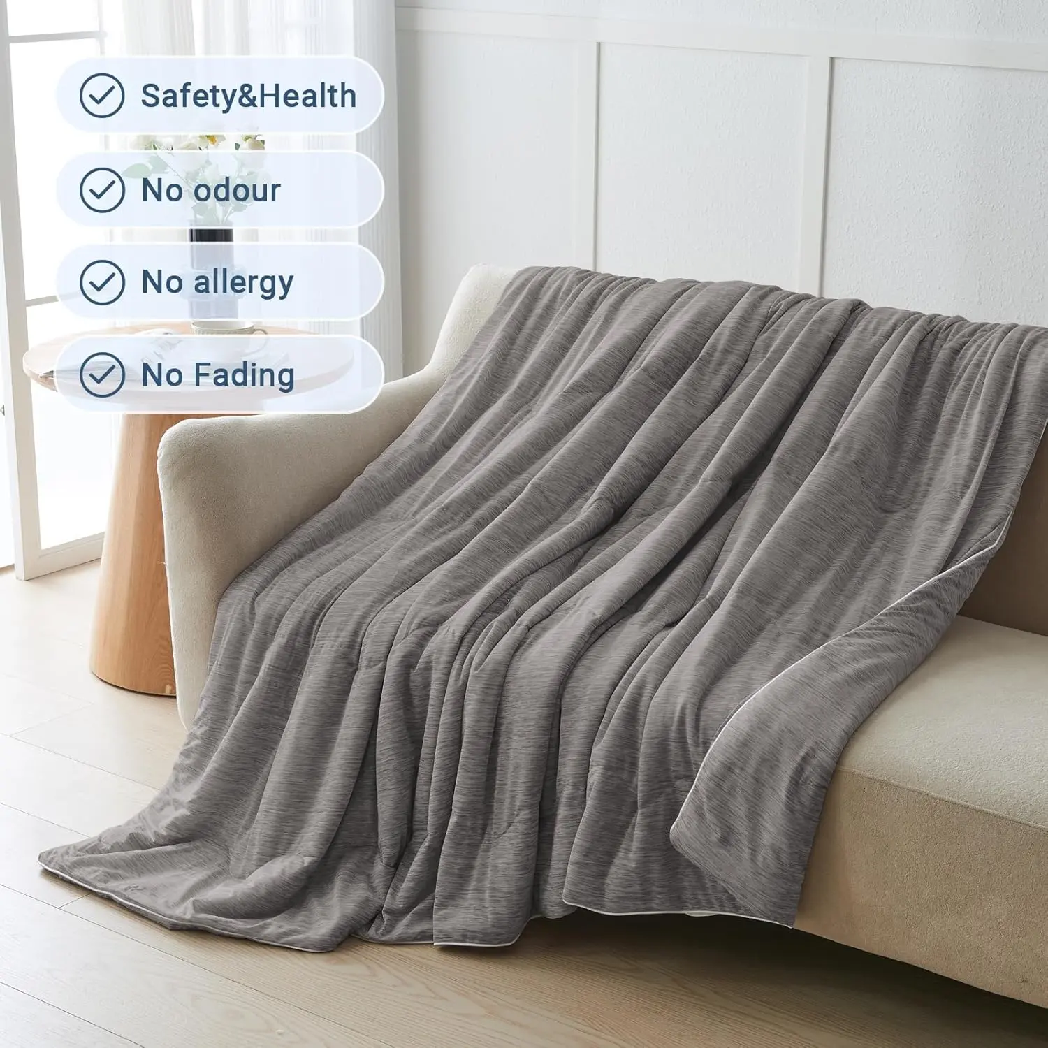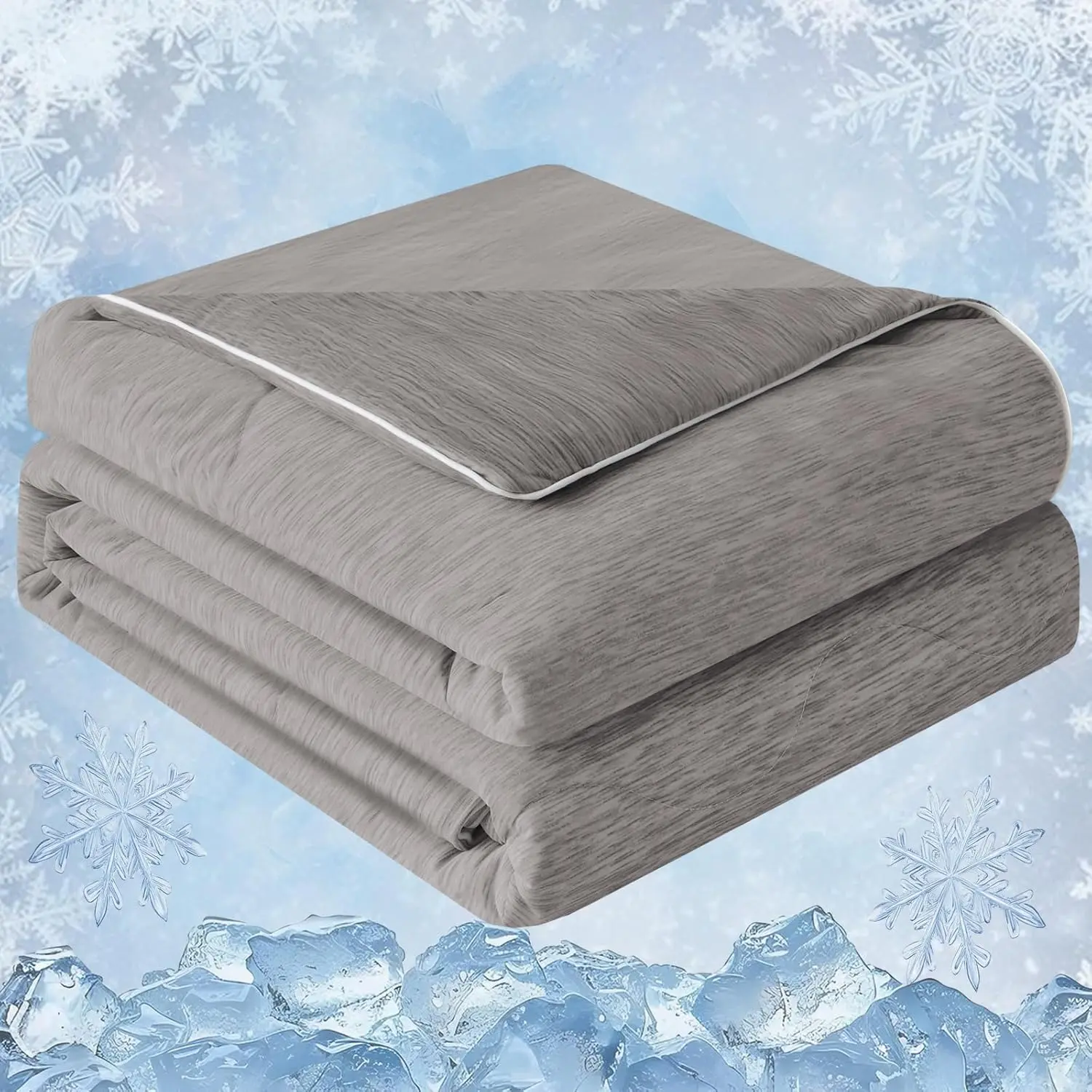 Advanced Cooling Technology: Cooling Comforter is crafted with premium double sided cold touch fabric, designed to absorb body heat and deliver an instant cooling sensation.Perfect for hot sleepers and those who experience night sweats, this cooling blanket ensures a drop in skin temperature by 2-5 degrees, providing a refreshing and comfortable sleep all night long.Breathable & Lightweight Design: Made with ultra breathable and moisture wicking cooling fibers, this lightweight summer cooling comforter is 3 times more breathable than cotton.keeping you cool and dry while offering a feather light, fluffy feel that adapts to your body’s curves for ultimate comfort.Silky Smooth & Skin Friendly: Experience the luxurious softness of our silky smooth cooling Comforter.The double sided fabric is gentle on your skin, free from static electricity, creating a soothing sleeping environment.Whether you’re a hot sleeper or just seeking comfort, this cooling comforter wraps you in a cloud like embrace.Stylish for Every Occasion: Available in multiple sizes and colors, the Cooling Comforter is perfect for any setting bed, sofa, office, or travel.Stay cool and comfortable wherever you go!Its stylish design makes it an ideal gift for loved ones on special occasions like birthdays, Mother’s Day, or Father’s Day.Easy Care & Durable: Our Cooling Comforter Designed for convenience machine washable and built to last. The precise quilting technology ensures the filling stays in place without clumping or tearing. Simply wash lightly at , avoid bleach and ironing, and hang dry to maintain its cooling properties and softness for years to come.