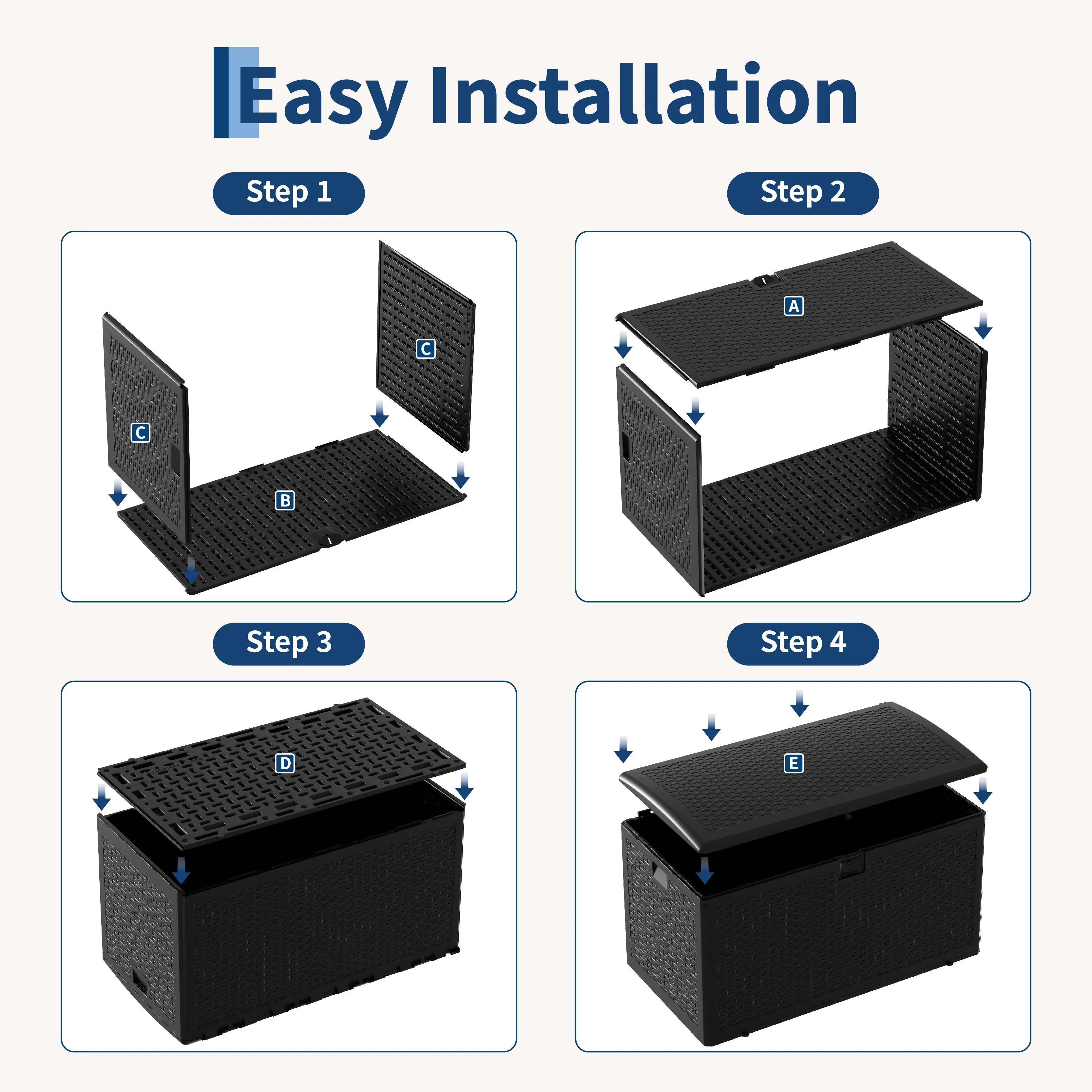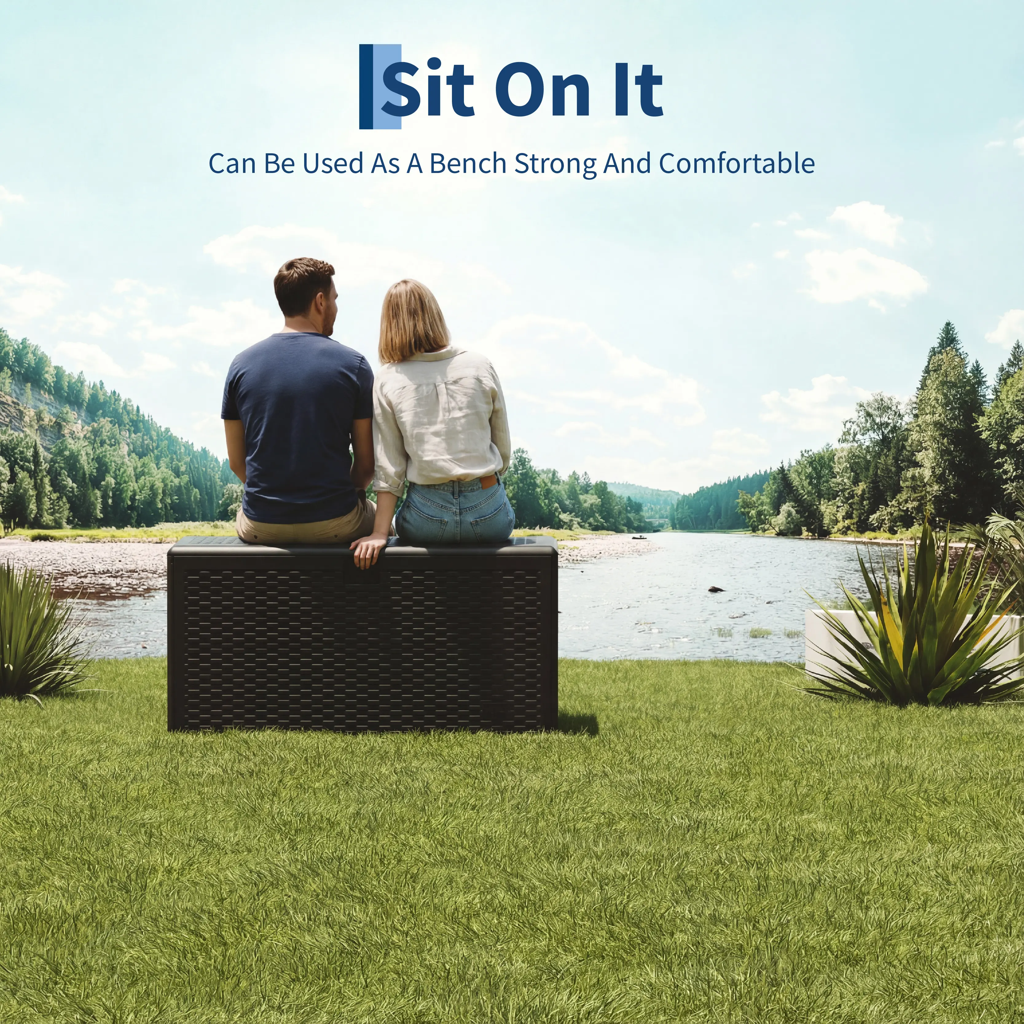 Introducing the 99 Gallon Outdoor Wicker Resin Deck Box, the ultimate storage solution for your outdoor needs. Crafted from high-quality HDPE material using blow molding technology, this heavy-duty storage container is designed to withstand the elements and provide long-lasting durability. Its waterproof construction ensures your belongings stay dry and protected, making it perfect for garden tools, patio cushions, pool accessories, and more.