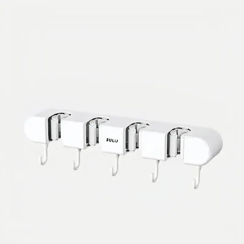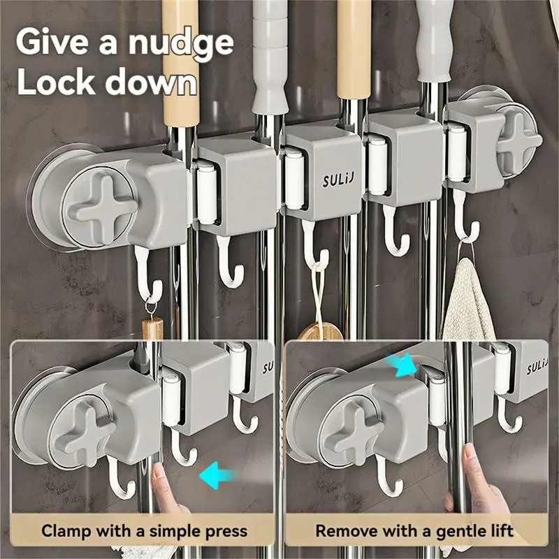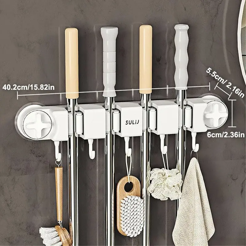 This wall-mounted broom holder features 4 racks and 5 hooks, perfect for organizing your kitchen, bathroom, and closet. It's a self-adhesive organizer, making installation easy and hassle-free. Keep your space tidy and clutter-free with this versatile storage solution.