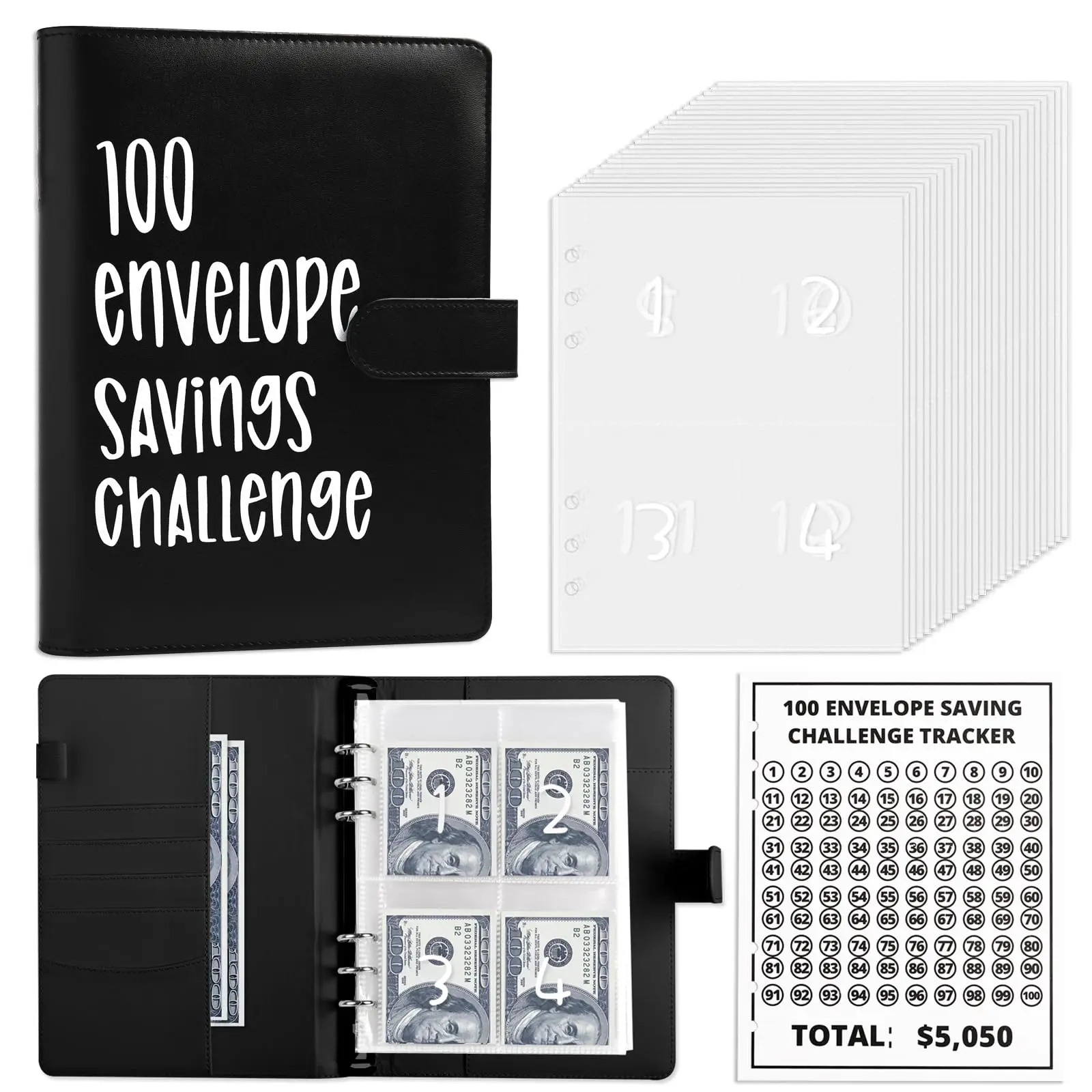 WHAT YOU GET: Our savings binder includes a high-quality PU leather A5 binder, 25 cash envelopes with numbered slots from 1 to 100, and a tracker sheet from $1 to $100. Use our binder to effectively manage your finances and save $5,050 by the end of the challenge!