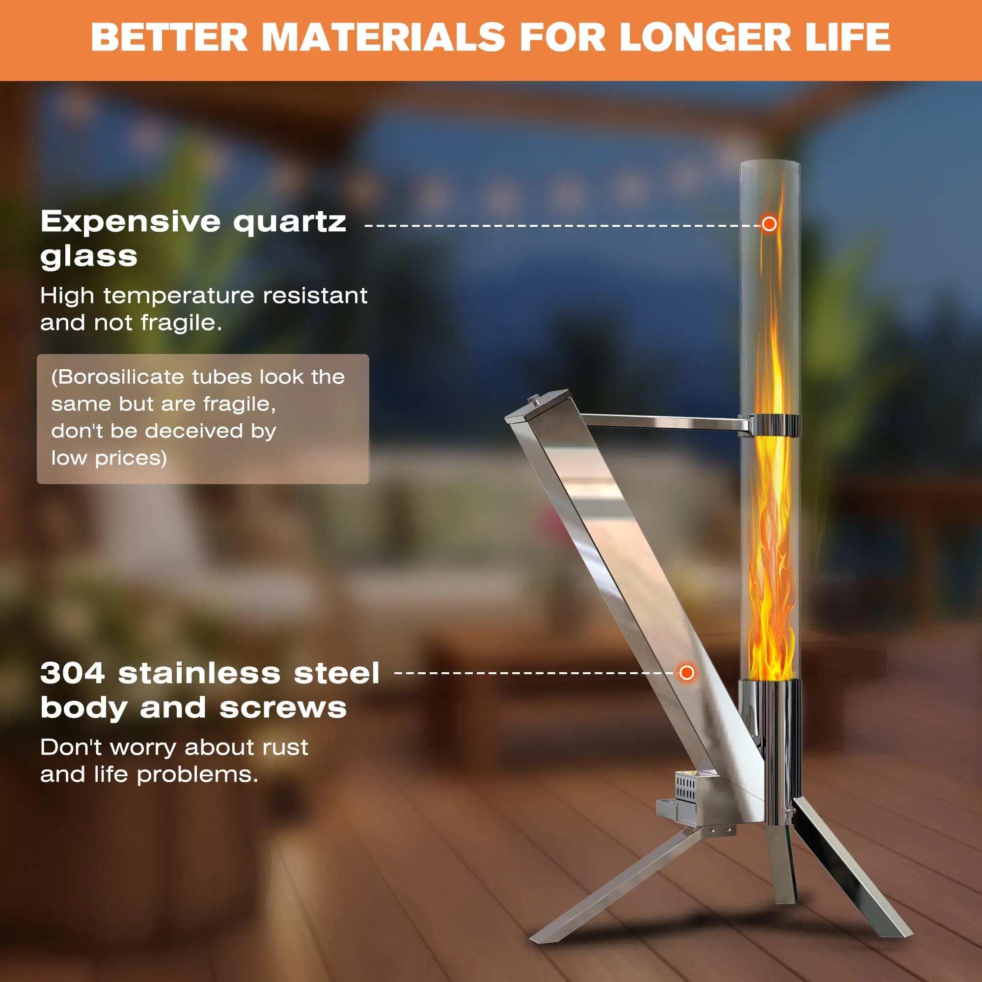 ·【2026 Upgrade Patio Pellet Heater】Ash box to avoid polluting any ground. Heat-resistant gaskets protect the glass tube in all directions. Glass tubes are quartz instead of borosilicate, which is more expensive and safer. Full 304 stainless steel includes screws, which are more durable without rusting.