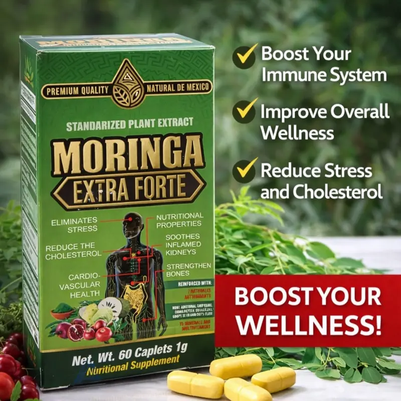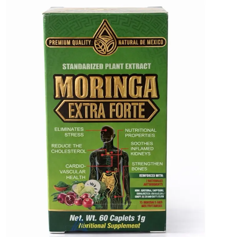 ✨ Moringa Extra Forte is a premium quality antioxidant dietary supplement. Each box contains 60 caplets, each weighing 1g. Ideal for cardiovascular health and stress reduction. 🌿
