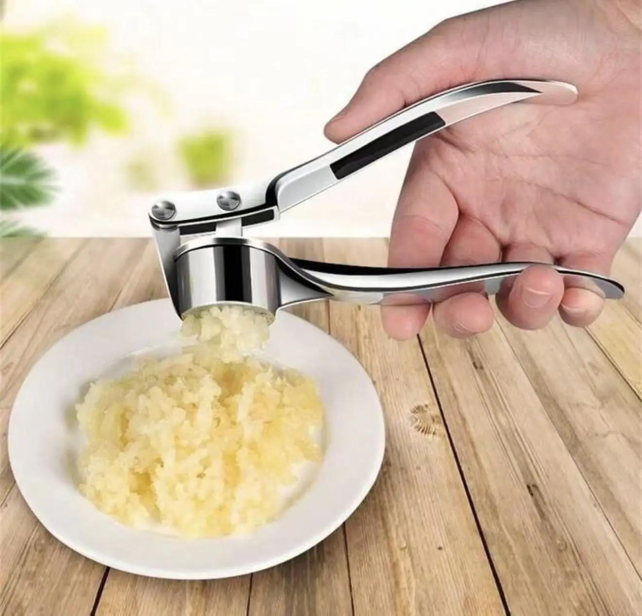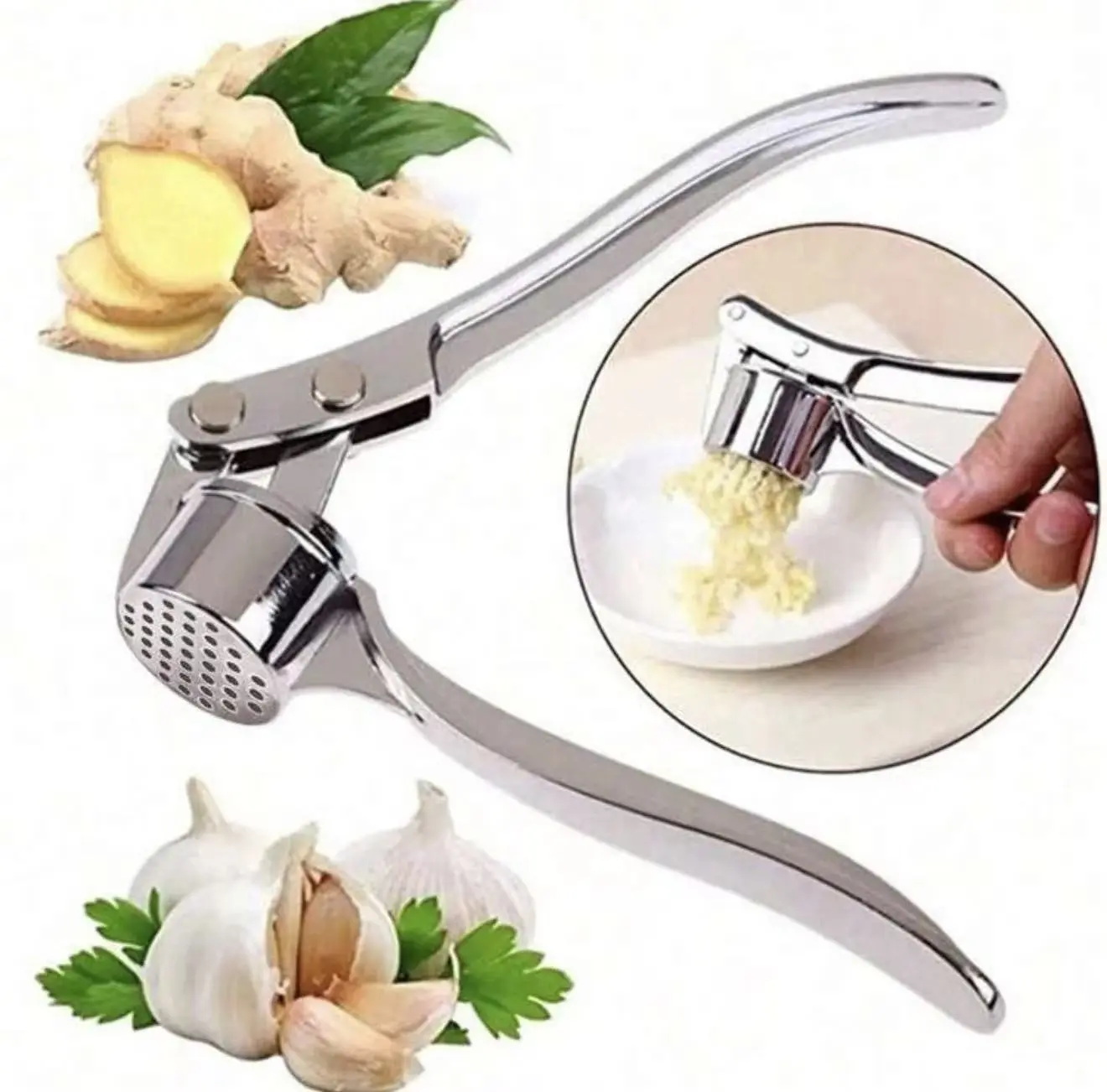 Stainless steel garlic press for easy crushing. Strong, durable, and easy to clean. Perfect for everyday cooking.