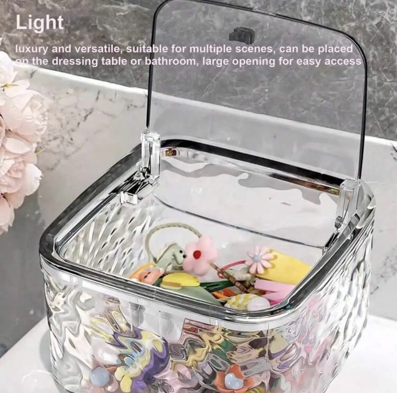 Upgrade your organization with this clear acrylic storage box. Designed for both style and functionality, it allows you to keep your everyday essentials neatly stored and visible. The secure flip lid protects contents from dust while offering easy access. Ideal for hair accessories, jewelry, or cosmetics, this organizer is a must-have for a tidy and elegant space.