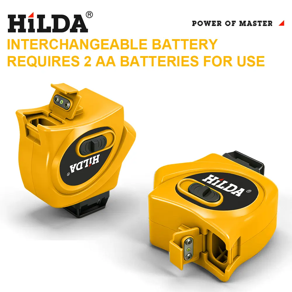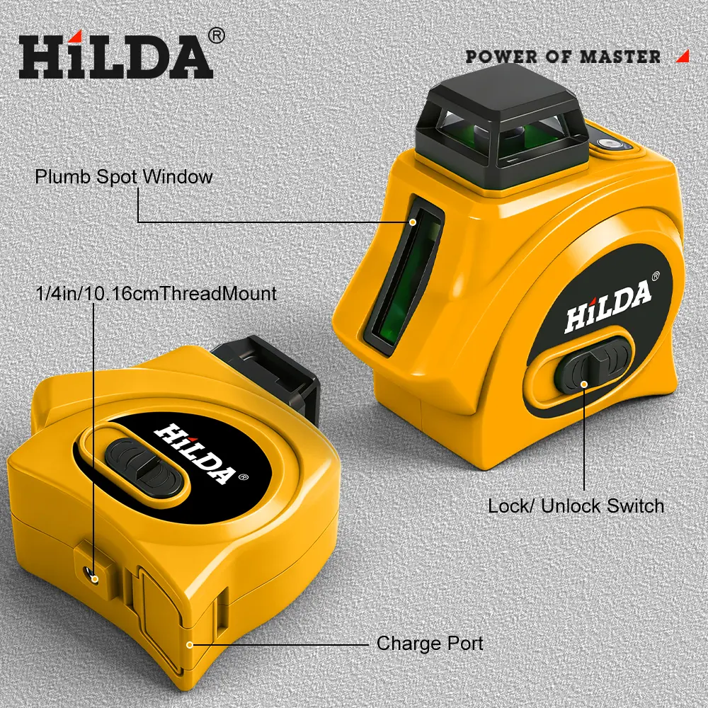 Engineered for professional precision, this HILDA laser level features a plumb spot window for vertical alignment, a standard 1/4" thread mount for tripod compatibility, and a lock/unlock switch for both automatic self-leveling and manual operation.
