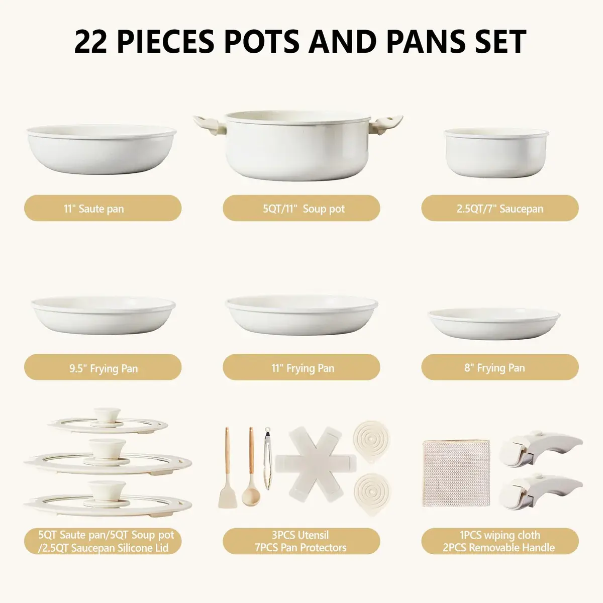 5. Complete Set Versatile for Every Meal: This cookware set includes an 8" fry pan, a 9.5" fry pan, an 11" fry pan, a 2.5-qt saucepan, a 5-qt soup pot, an 11" sauté pan, matching glass lids, and kitchen utensils. Extra accessories like petal-shaped pan protectors and cleaning cloths add convenience and value. A practical all-in-one choice for families, apartments, and canteens.