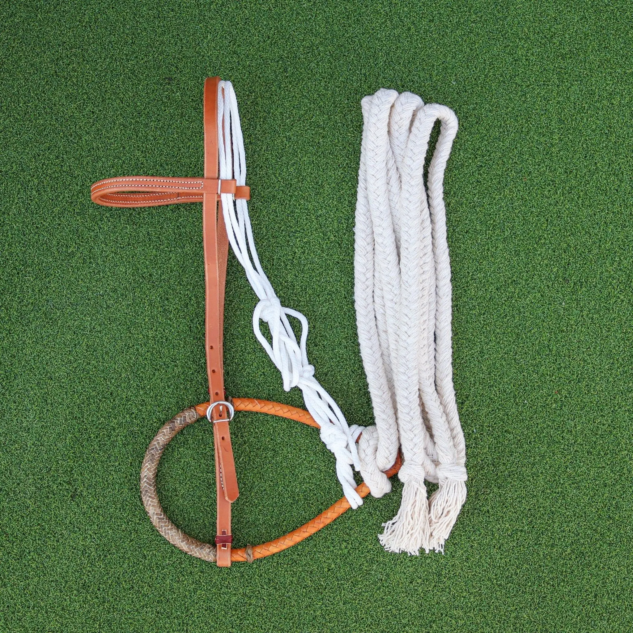 USA-Made Breaking Training Hackamore Set (Horse Size) | Pencil Bosal + Russet Headstall + 14 ft Reins