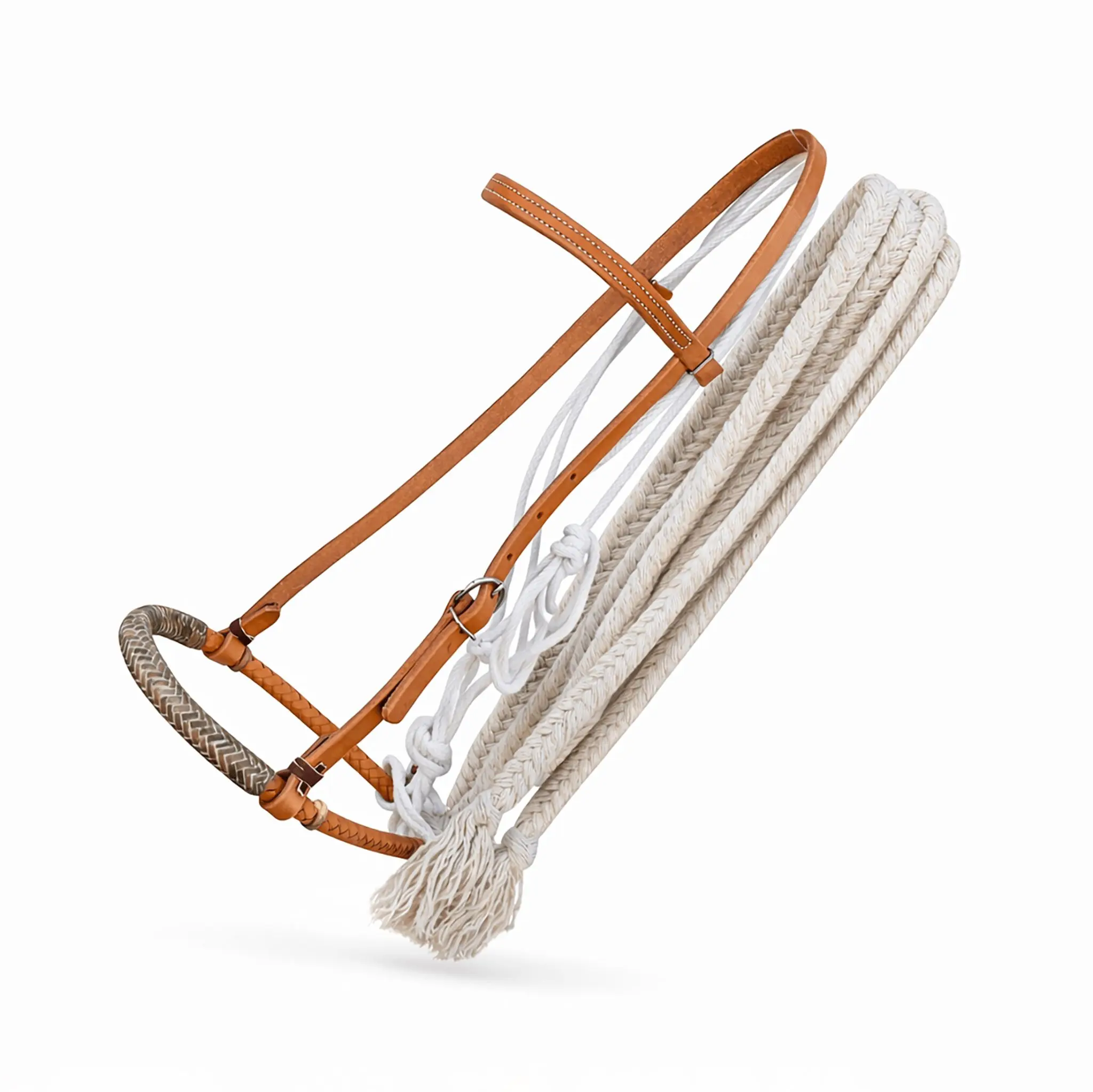 Built for real training and long days of use, this USA-made breaking hackamore set is made to hold up when your horse is learning and your tack needs to stay dependable. The pencil leather/rawhide bosal features a contrasting rawhide/leather overlay for a sharp, traditional western look, while still delivering the firm, consistent feel riders want during groundwork and riding. Paired with a russet leather browband headstall and 14 ft soft cotton braided reins, you get comfort in the hand and steady contact when it counts.