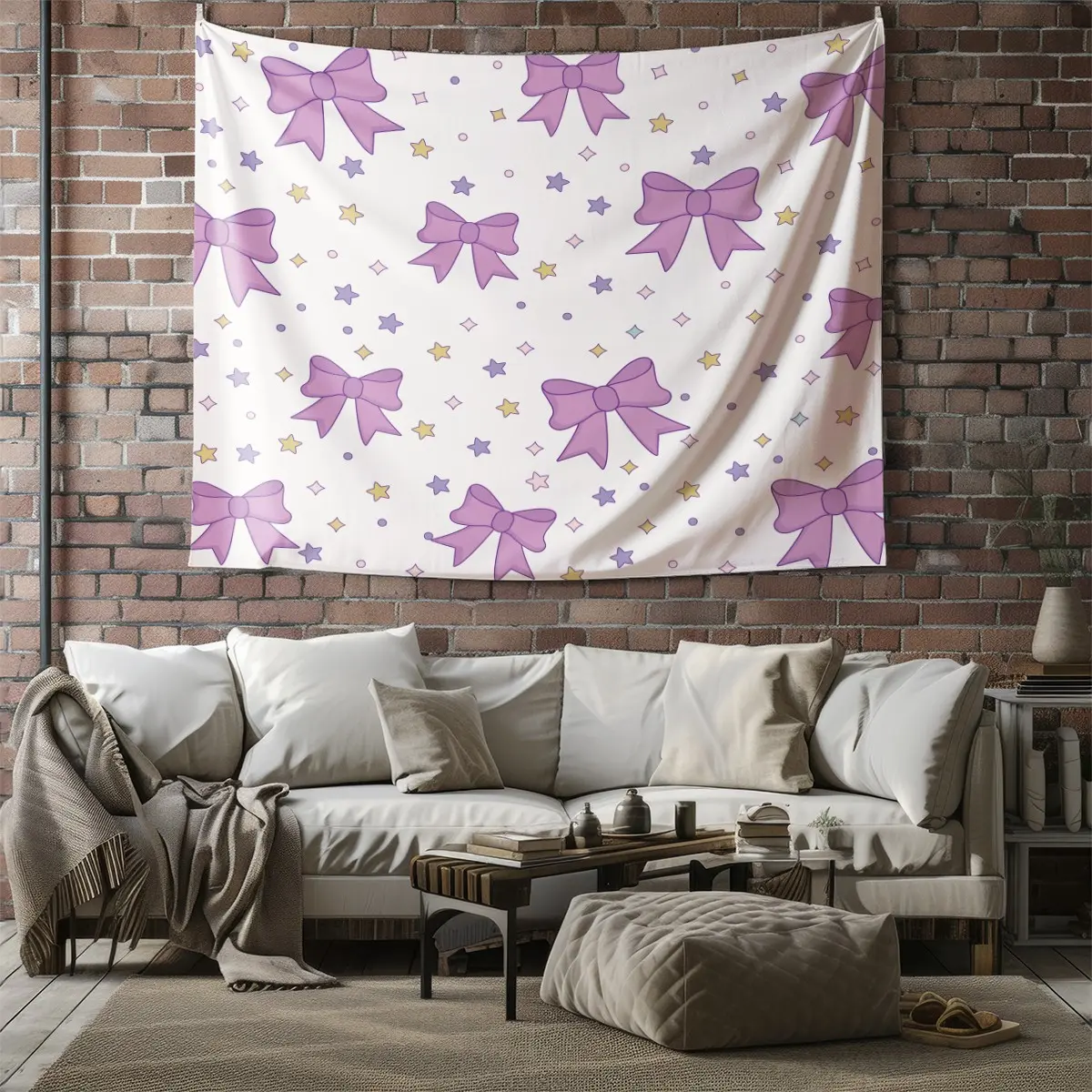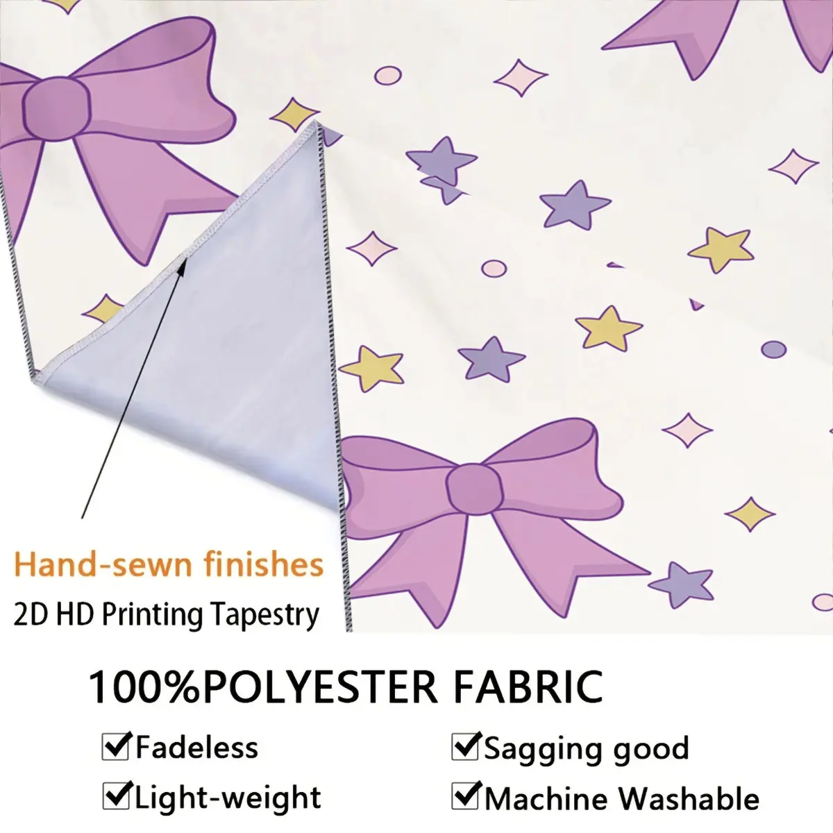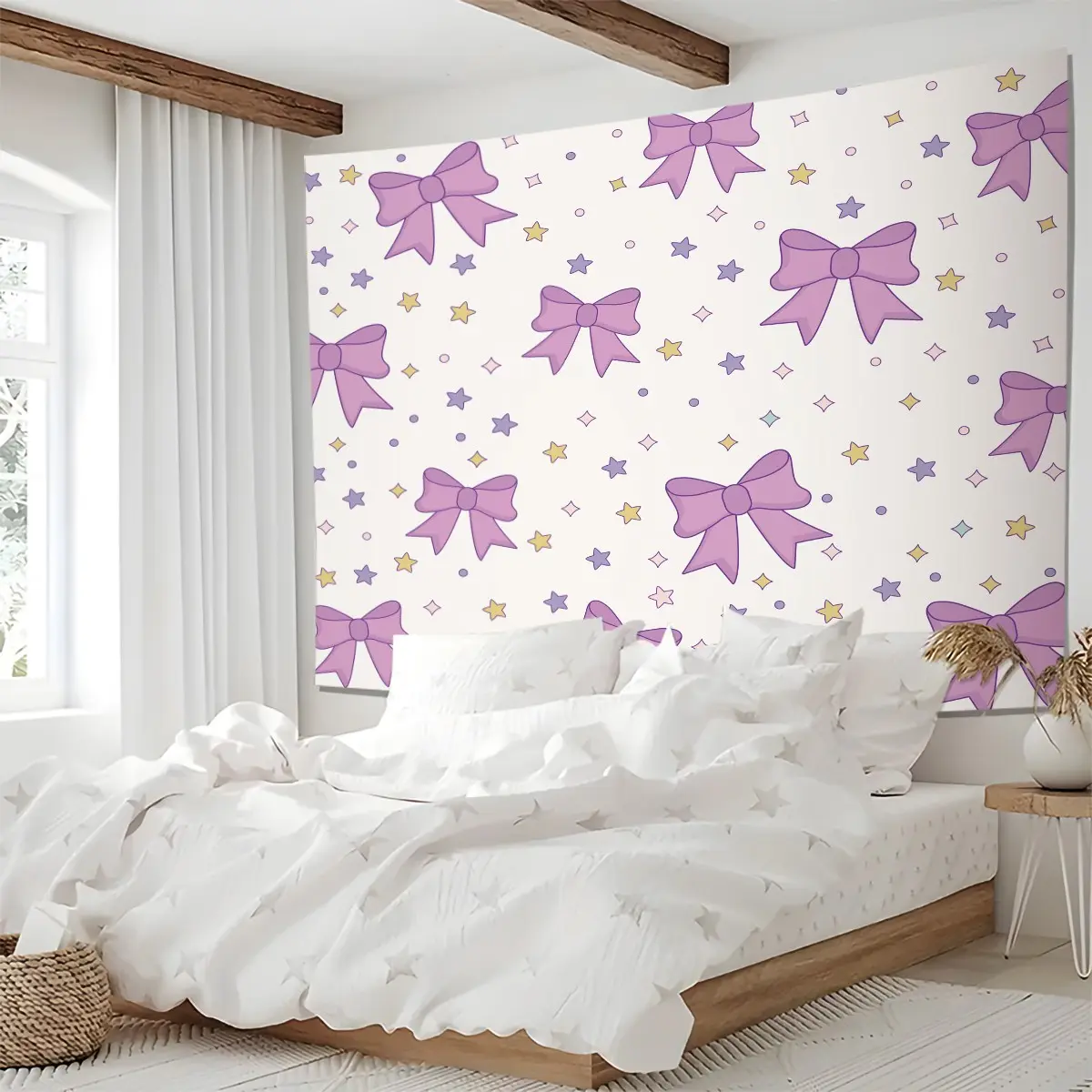 Purple Bow Tapestry, Cute Star Print Wall Hanging, Aesthetic Tapestries Wall Blanket, Coquette Room Decor Backdrop Decor, Soft Fabric Wall Art for Bedroom Living Room Dorm