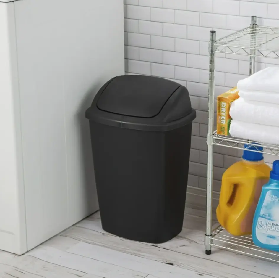 The Sterilite Kitchen Trash Can, 7.5 Gallon Plastic Garbage Bin with Swing Top Lid, Black combines modern style with everyday convenience. Its SwingTop lid opens effortlessly when lightly pushed and features an integrated handle that allows the lid to lock into place for easy disposal of larger items. Even when the trash can is flush against a wall or cabinet, the lid fully swings open. When closed, the lid conceals the trash for a neat, clean look. Designed to hold a standard 8-gallon trash liner, this durable plastic garbage bin has an easy-to-clean textured finish. This SwingTop trash can makes cleanup quick and simple. Ideal for kitchens, offices, or garages.