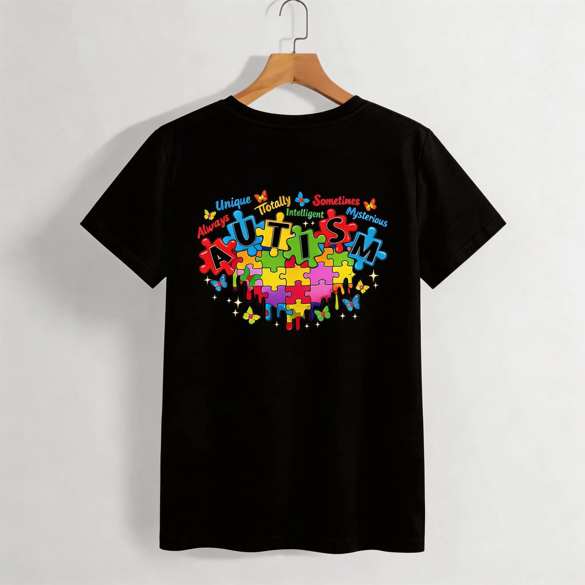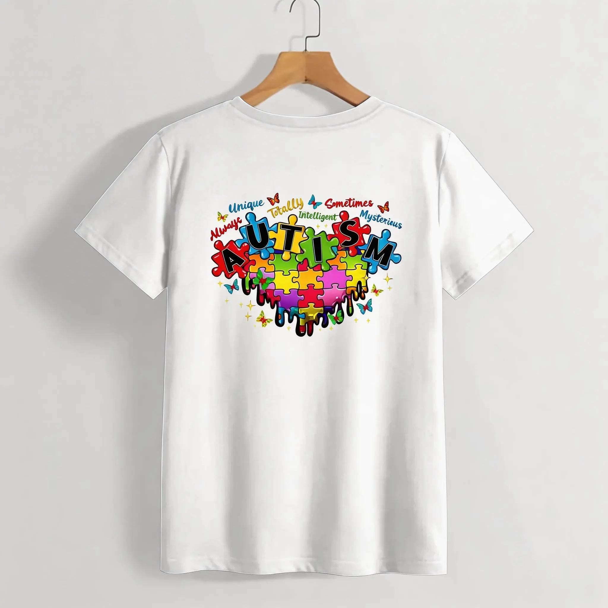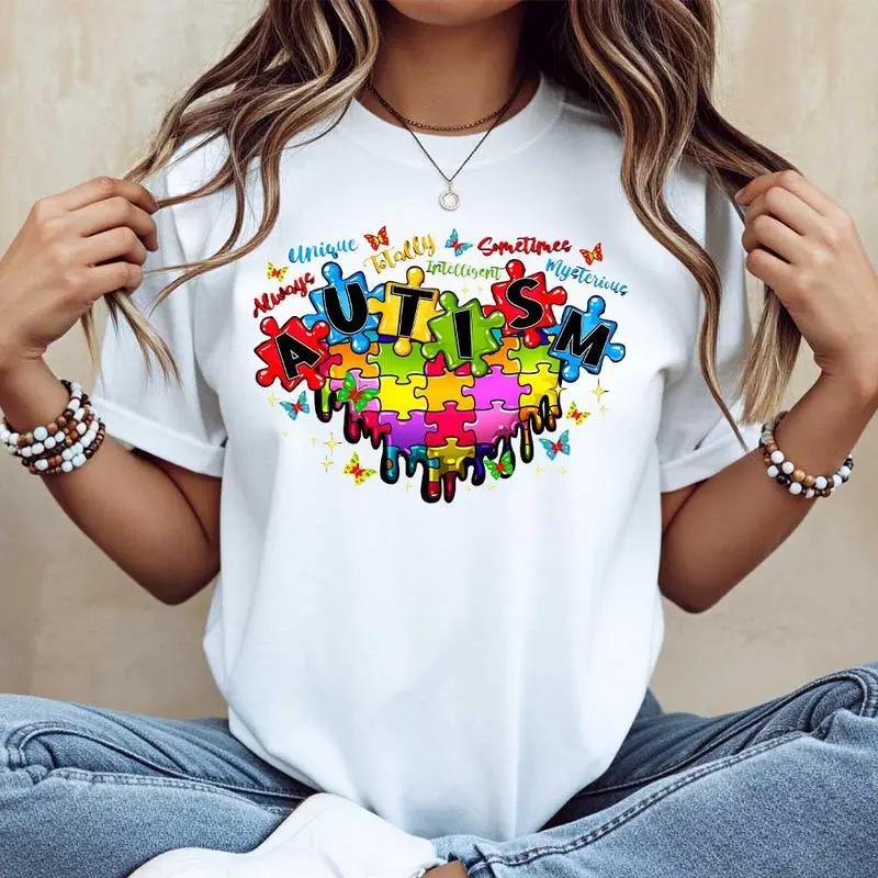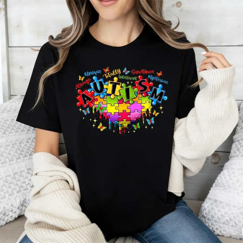 This T-shirt features autism puzzle pieces and inspirational words, perfect for autism awareness. It's a casual, loose fit, ideal for everyday wear. The design promotes understanding and support for autism. Wear it to show solidarity and spread awareness.