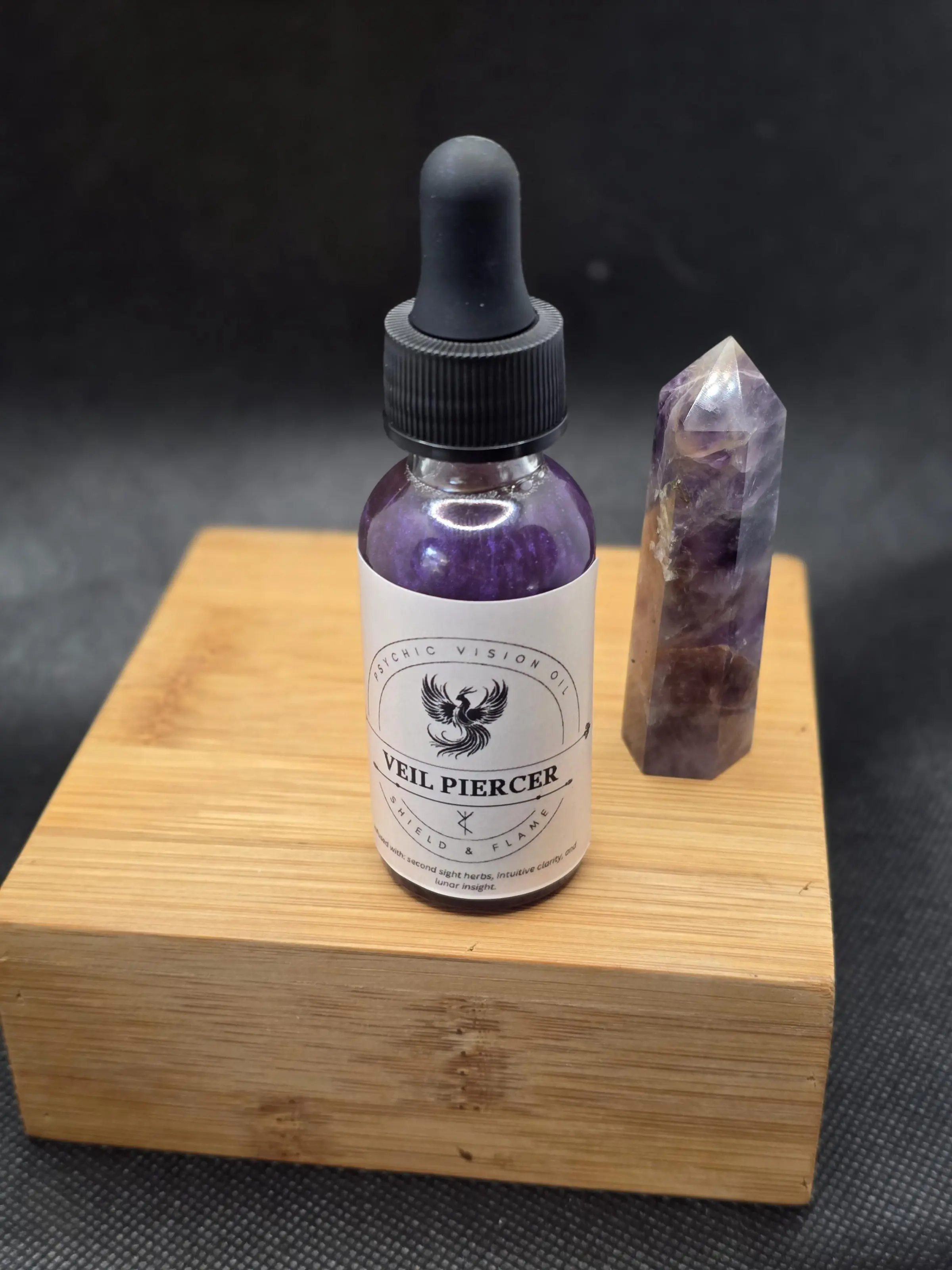 -Veil Piercer - Intuition & Psychic Sight: Crafted to open your third eye and part the veil between worlds. Veil Piercer supports divination, dreamwork, and intuitive clarity. Infused with visionary herbs and lunar energy, it’s a key to the unseen.