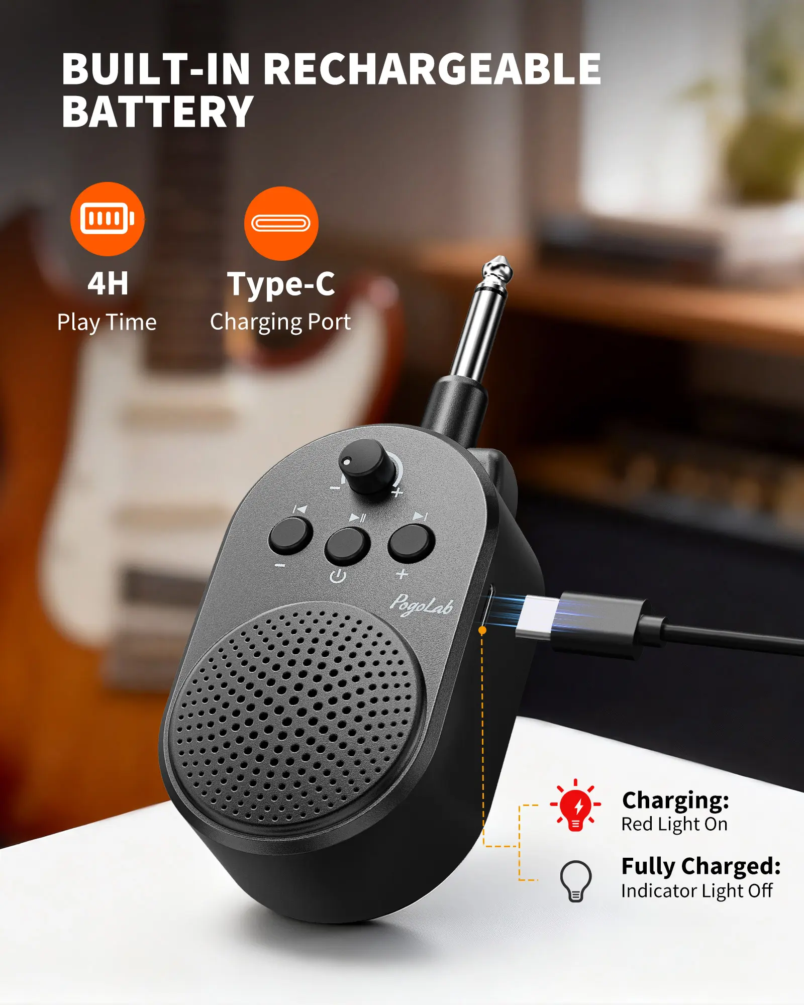 ·Bluetooth Music Control & PlaybackThe POGOLAB Pocket Guitar Amp features seamless Bluetooth connectivity, allowing you to play/pause tracks, skip songs, and adjust playback volume directly through the amp for a fluid practice or performance experienceInstrument volume is controlled independently via built-in buttons, ensuring a perfect mixDelivering crisp, bright sound, it is the ideal portable companion for every session