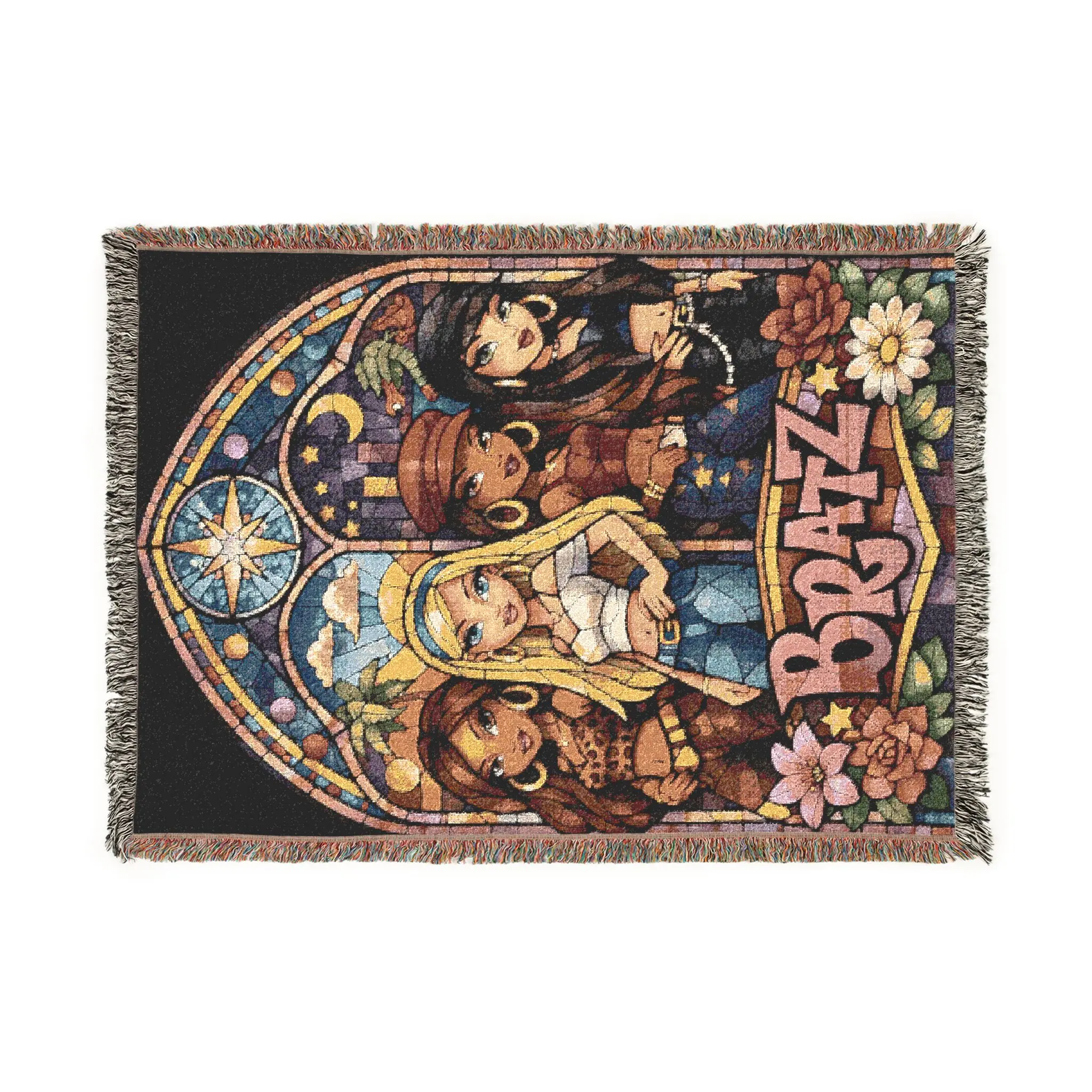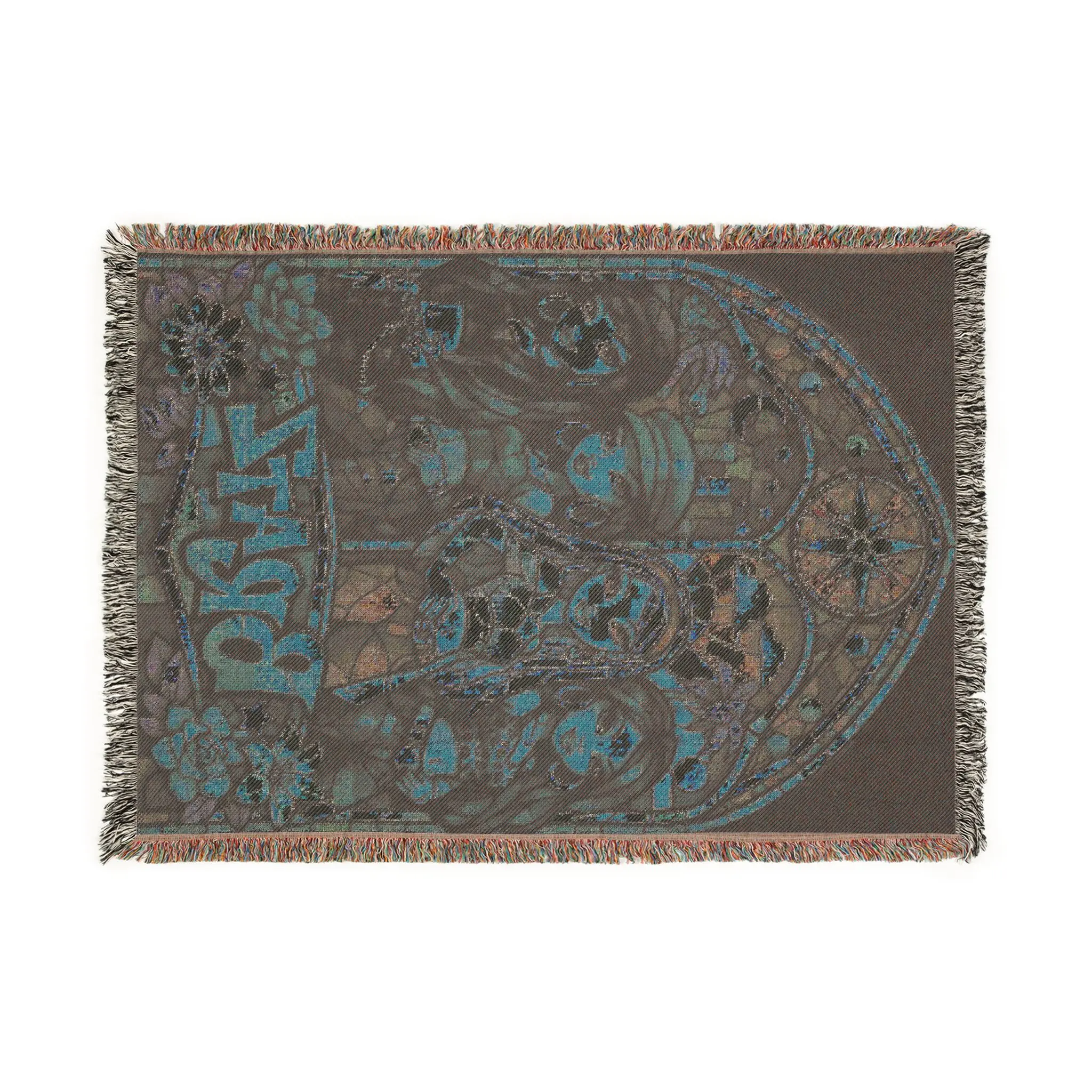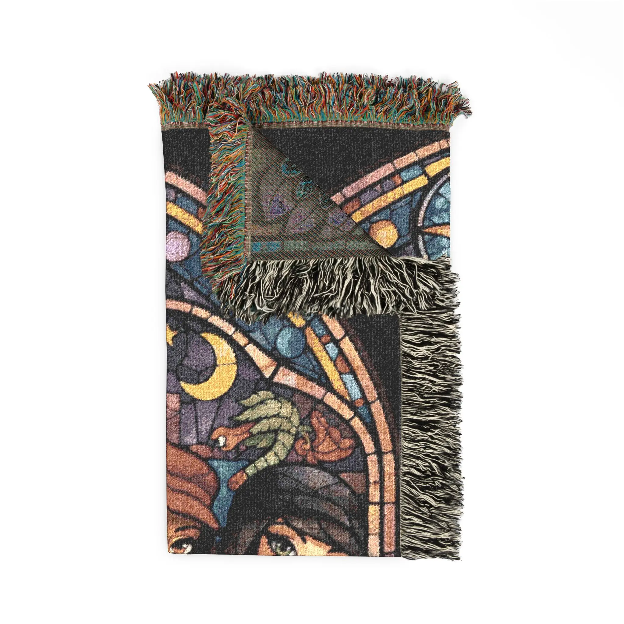 This woven blanket brings a vintage, chapel-stained-glass vibe to cozy evenings. Handwoven cotton threads form a richly detailed scene with bold color blocks and a textured, tapestry-like finish. Colorful fringed edges frame the design, adding a finished, heirloom feel that sits comfortably on a couch, layered at the foot of a bed, or draped over a reading chair. Choose the Artwork variant for crisp, graphic clarity or the Photo variant when you want smoother gradients and photographic detail. Lightweight but sturdy, it’s meant to be both decorative and lived-in — the kind of piece that ages with touch and becomes part of your room’s story. Note that mockups simplify the weave; the real blanket has tactile depth and subtle thread variation.