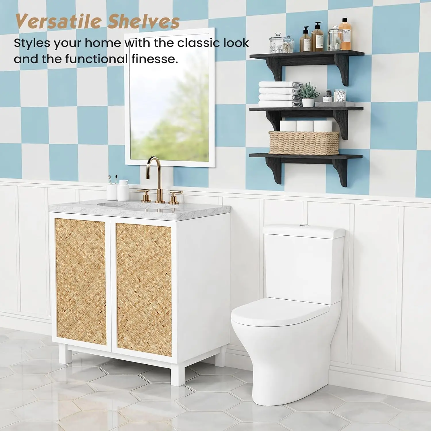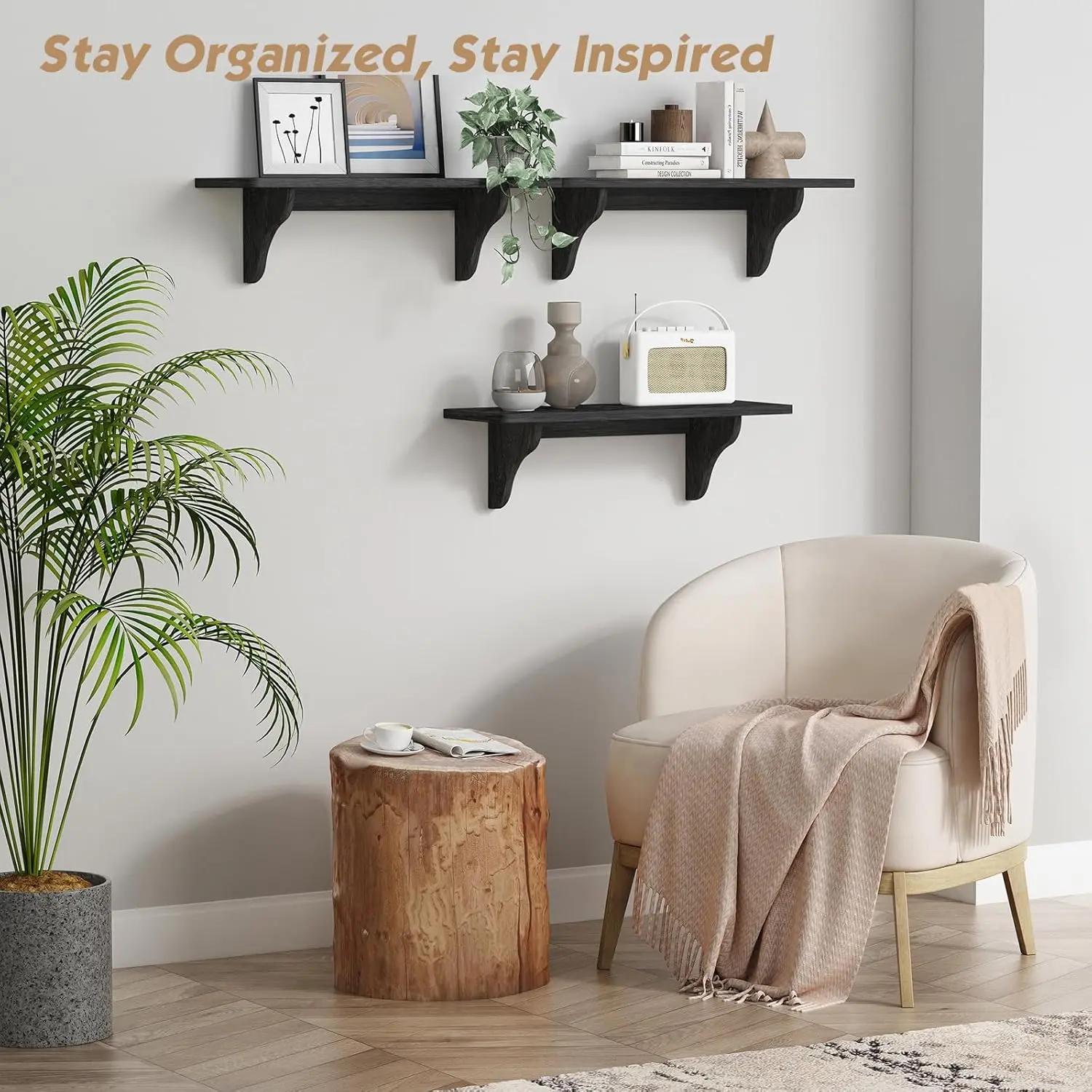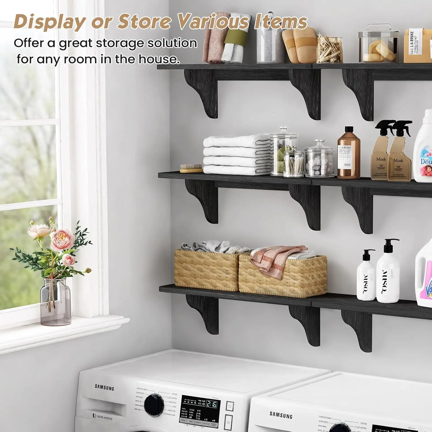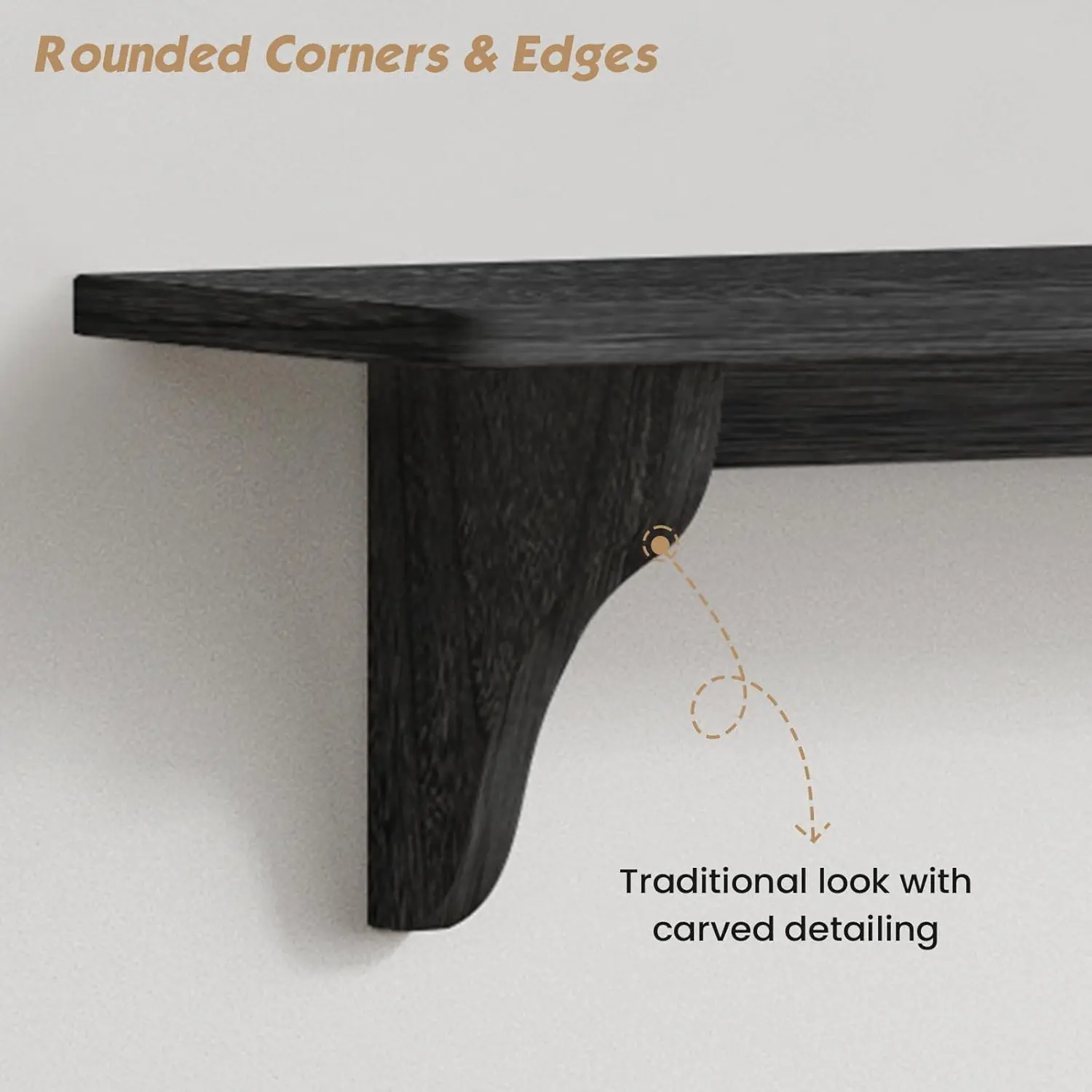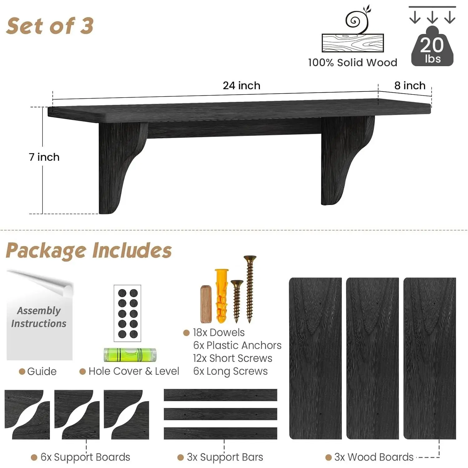 [Versatile & Decorative ]These 24 inch shelves for wall combine wood shelves and arched bracket in a classic profile, look simple but decorative. Perfect perch for wall decor, books, indoor plants, pictures, photo frames and more. These bedroom wall shelves add a dressed-up look to your bedroom, living room, bathroom, nursery, office, Kitchen. [Your Storage, Your Way]The classic "arched" pattern wood bracket design presents antique stylish. Install these 24 inch Long 8 inch deep floating wall shelves with the arched bracket provide best choices for your layout ideas, in a ladder shape, or in a line, or a symmetric way, or separate them in different rooms - the opportunities are endless. [Sturdier and Easy to Install]The size for each of these storage wood shelves wall mounted is W 24"* D 8"* H 7" and is wider and sturdier for your general requirement, remarkable durability, and load capacity for each shelf up to 20 lbs. Easy to assemble with all necessary hardware included according to the instruction steps. [A Stage for All]These black floating shelves for wall 24 inch are ideal choices for any room of the home - from displaying artwork, collectibles figures in the bedroom area to holding books and wall decor in a living room space or organizing towels and toiletries for bathroom over the toilet. [Practical Gift Idea]The aesthetic & versatile 24 inches long decorative wall shelves with gorgeous box is a perfect gift for your family and friends as mom birthday, anniversary, Thanksgiving or Christmas gifts. We will deliver outstanding products and service to you, your family and friends in every interaction, every time.