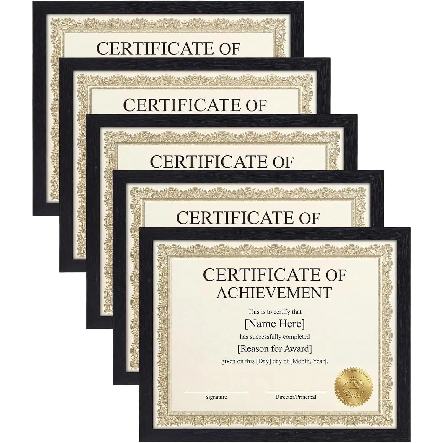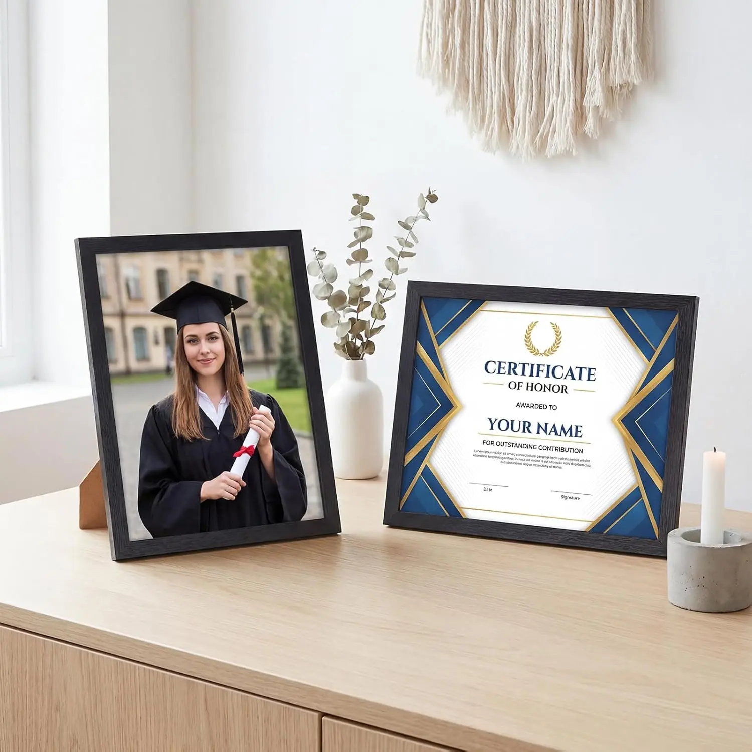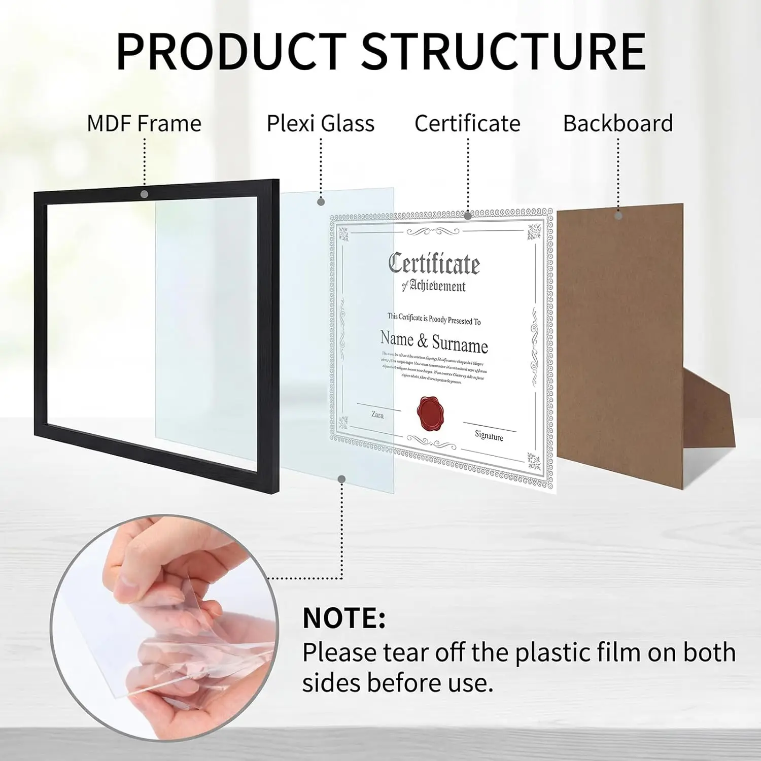 Unbeatable Value: Maximize your display and budget with our 5-pack of 8.5 by 11 picture frames! Perfect for crafting a stunning gallery wall or showcasing a series of certificates, diplomas, and awards. Premium MDF & Shatterproof Clarity: Crafted from sturdy MDF wood, our 8.5 x 11 frames resist warping and provide lasting protection. Paired with our high-definition, shatterproof front panel, they offer superior safety-ideal for homes with kids or busy offices. Note: Please tear off the plastic film on both sides before use. Easy Installation: Each certificate frame features 6 secure flip tabs, tool-free photo swapping. Use the built-in stand for instant tabletop display horizontal or vertical, or with non-marking peg hooks for wall mounting. Precision Fit, Perfect Arrival: Guaranteed perfect fit for standard 8.5x11 document sheets. Each frame’s interior measures precisely 8.6 x 11.1 (21.8 x 28.1 cm). We ensure flawless delivery, our frame is shipped in reinforced packaging. The package includes 5 frames, all necessary hardware, and a guide. Thoughtful Gift: More than just a 8.5x11 picture frame, this set is a gift of pride. Its timeless matte black finish complements any decor, making it the perfect graduation, retirement, or housewarming gift. Help loved ones proudly display their milestones, family portraits, or travel memories.