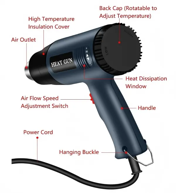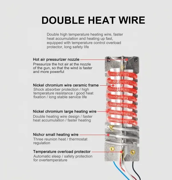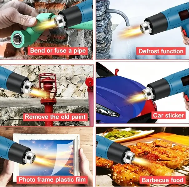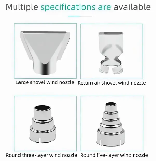 Comes with 4 different nozzles for various heating needs. Suitable for vinyl wrap, heat shrink tubing, paint stripping, PVC processing, craft making, and home DIY projects. The dual-side air intake ensures efficient heat dissipation, low noise, and stable long-term use.