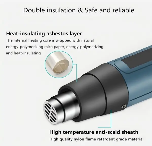 This heat gun features an LCD digital display for real-time temperature monitoring. It offers adjustable temperature settings from 140℉-1202℉ (60℃-650℃). Two modes provide flexible temperature and airflow control, ideal for various DIY and home projects. The dual heating structure ensures fast and even heating with stable airflow output.