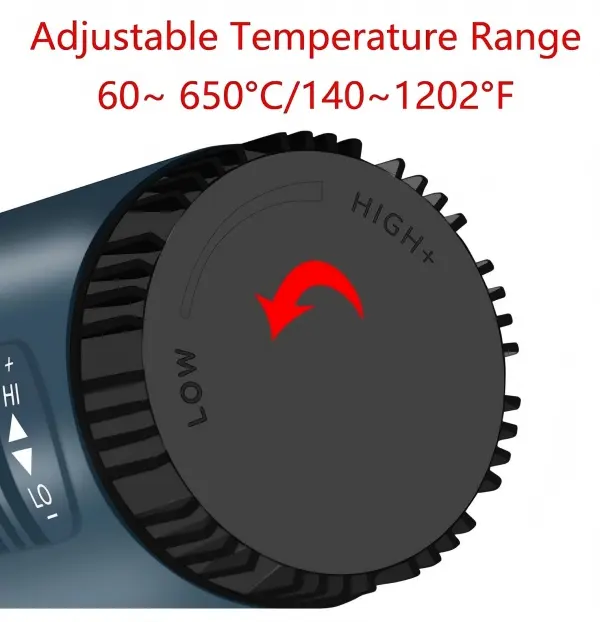 Temperature Range: 140℉-1202℉ (60℃-650℃). Airflow: 2 levels adjustable. Display: LCD Digital Display. Accessories: 4 nozzles included. Plug: Standard US plug. Ships from US Local Warehouse with fast delivery and reliable logistics. Contact us for any questions.