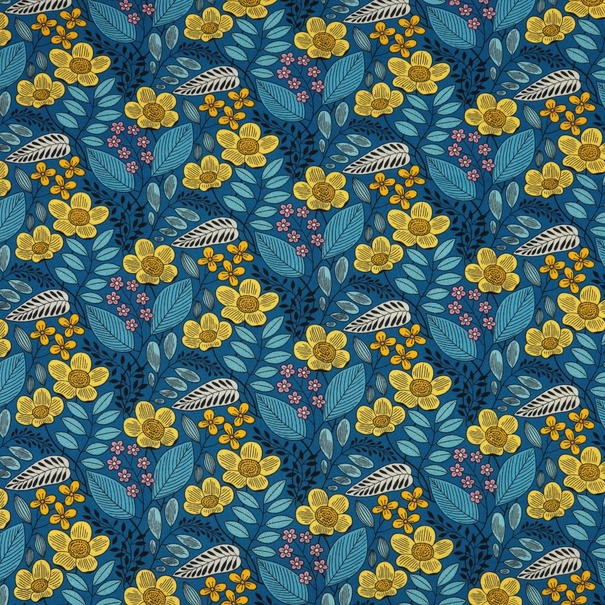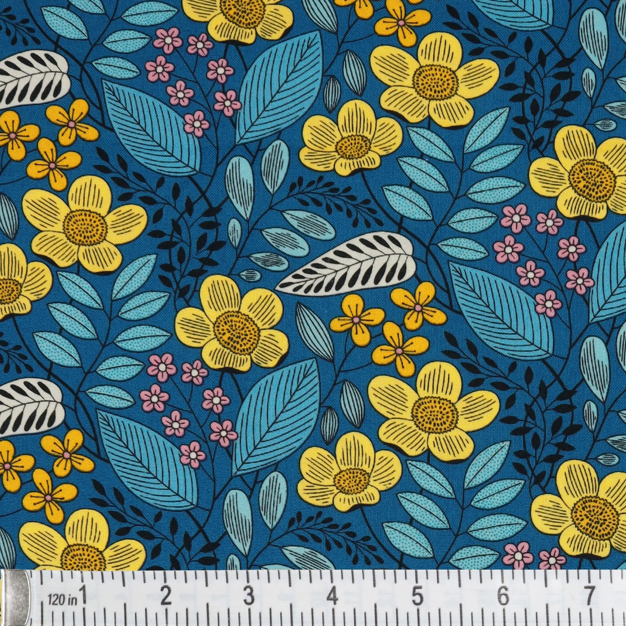 Let your creativity blossom with Olivia Blue, a striking floral from the Blooming Color 2 Fabric Collection by Wolff Paper for Benartex Fabrics. This bold print features buttery yellow and blush pink blooms framed by airy blue foliage and black-and-white accent leaves, all set against a rich, royal blue background. The detailed linework and saturated hues make this fabric perfect for adding a modern folk-art flair to your quilting and sewing projects. Printed on 100% cotton and measuring approximately 44" wide, it's ready to bring high-impact color to your next masterpiece.