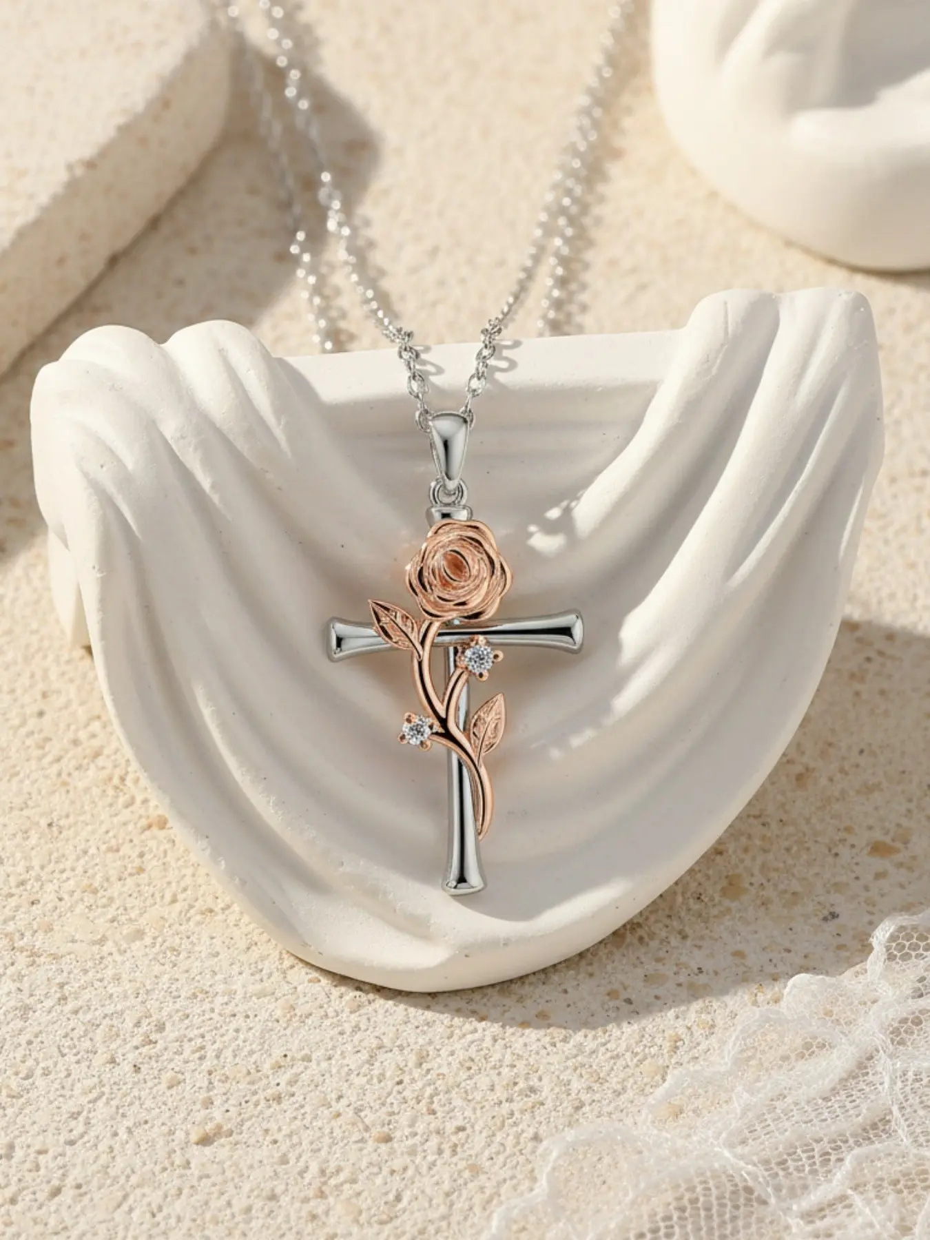 Blazing Rose Vow · Silver Rose Premium and stylish rose & cross necklace, elegant and fashionable.Paired with a surprise double-door preserved rose jewelry gift box.Ideal gift for birthdays, Mother’s Day and Valentine’s Day.
