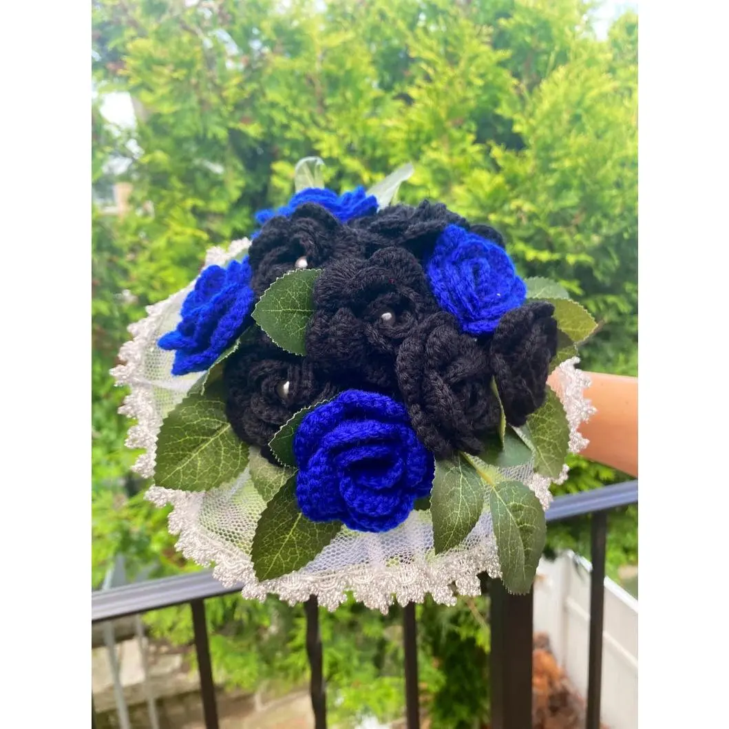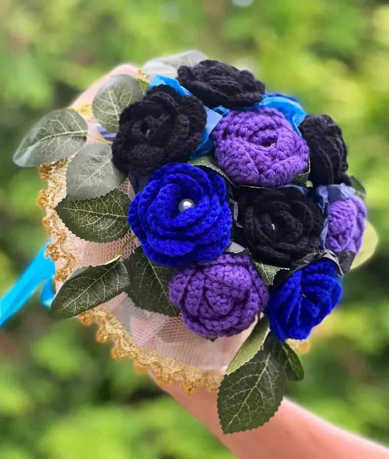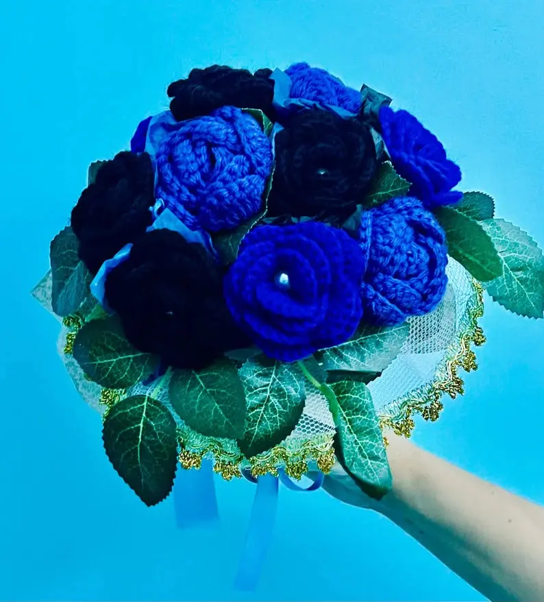Featuring a striking combination of deep royal blue, rich violet, and jet black roses, this handmade crochet bouquet offers a unique, modern twist on traditional flowers. Every petal is meticulously hand-crocheted by skilled artisans, making each bouquet a one-of-a-kind work of art.