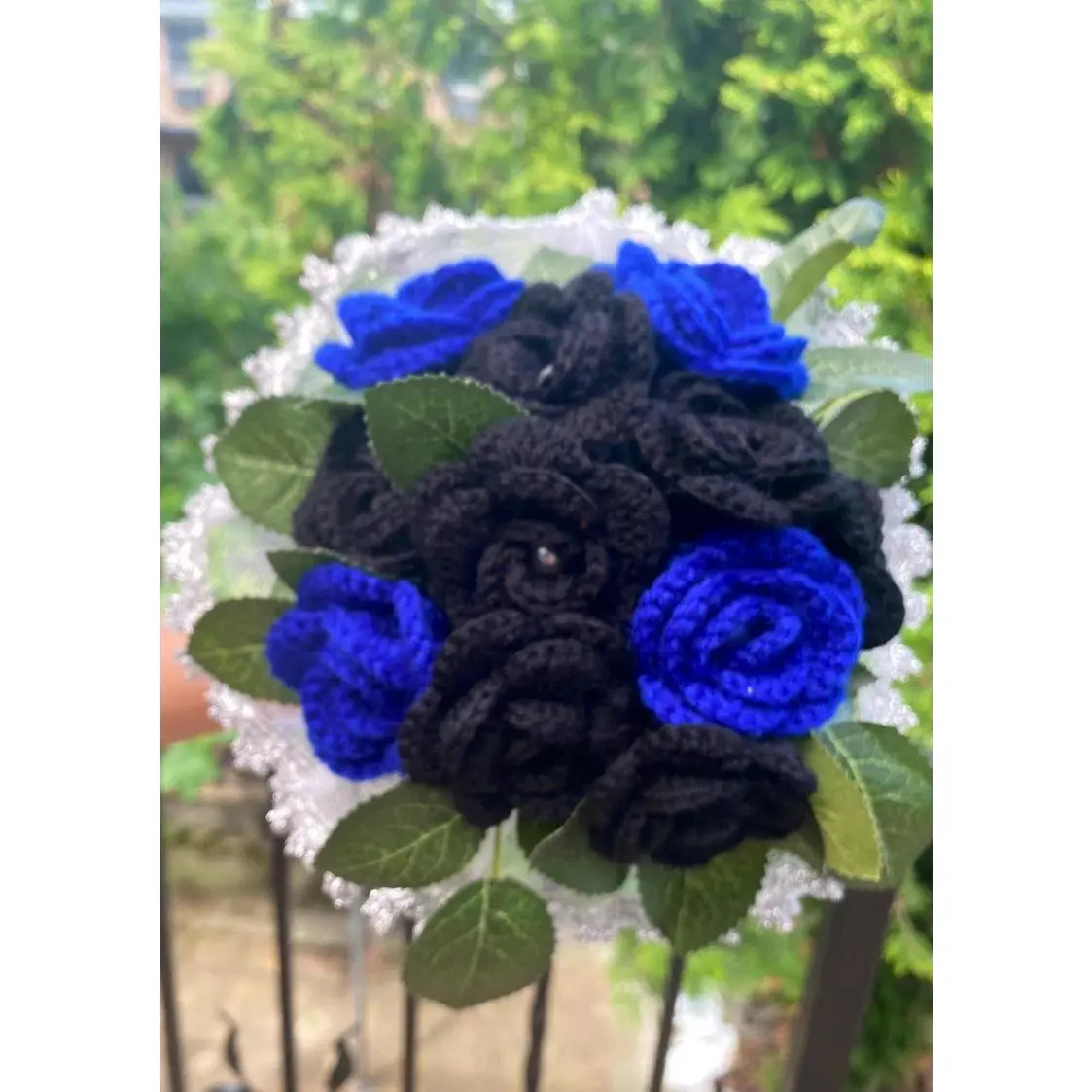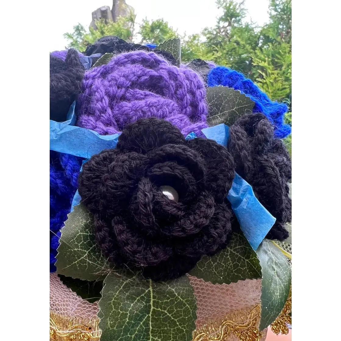 ·Composition: Hand-crocheted rose bouquet in blue, violet, and black