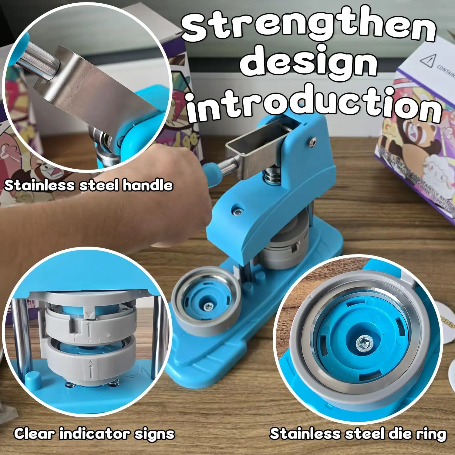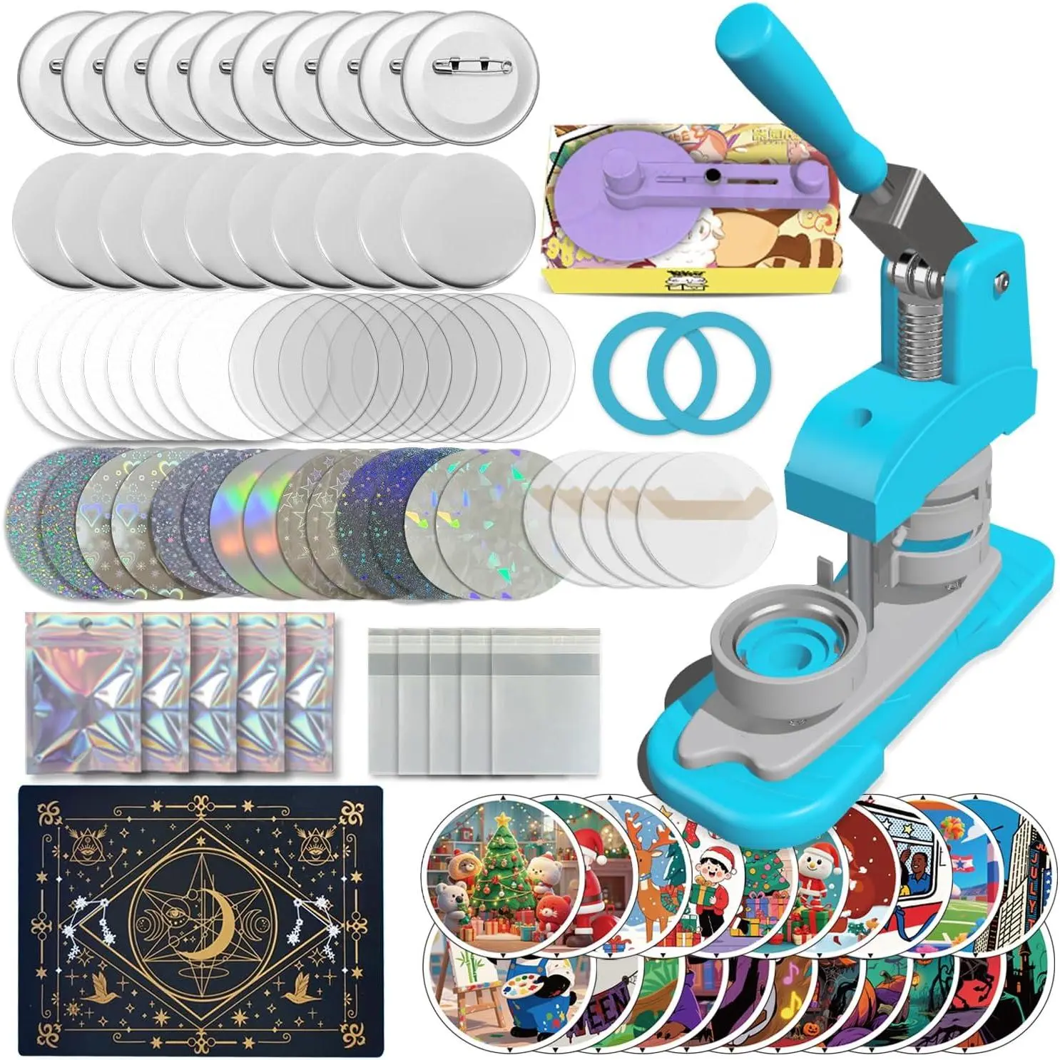 🎁DIY Button Maker Machine Kit Includes: 58mm (2.25 inch) Badge Maker, Circle Cutters, 50pcs Button Parts, 50pcs Blank Paper, 100pcs Transparent Film, 14pcs Colored Film, 10pcs Pattern Paper, 1pcs Cutting Board, 2pcs Gasket, 5pcs Protective Case, 5pcs Transparent Bags, 5pcs Holographic Bags.With its beautiful packaging, this button machine can be given as a gift for kids and DIY enthusiasts.🎁Multiple Functions: This DIY badge making machine offers versatile uses, allowing you to create small gifts like pin badges, mirrors, openers, fridge magnets, keychains, pendant medals and so on.🎁New Design: This machine adopts high-strength engineering plastics, with its handle reinforced by stainless steel for enhanced pressure resistance.Its body and button mold are integrated, featuring light weight, a long lifespan, and easy operation.Additionally, the handle is scientifically calibrated to help you find the optimal pressure, significantly improving the stability and success rate of badge making.🎁Wide Application:You can make various DIY badges: choose your favorite pictures to create custom designs, or make personalized badges.Use the button pin maker to design pins for decorating jackets, backpacks, or hats-perfect for DIY home projects or personalized gifts.The pin maker machine is widely used for school activities, children's birthdays, opening ceremonies, business activities, Thanksgiving, holiday gifts, souvenirs, etc.🎁Easy Handling:First, cut pictures to the proper size with the simple, easy-to-use circle cutter punch press.Second, set the 58mm badge bottom and top moulds on the button machine.Third, place the badge metal cover into the top cover mould and the picture on the cover.Fourth, place the transparent film on the picture and press down the badge making machine handle.Last, add the metal pin backing to the bottom cover mould and press the handle again.