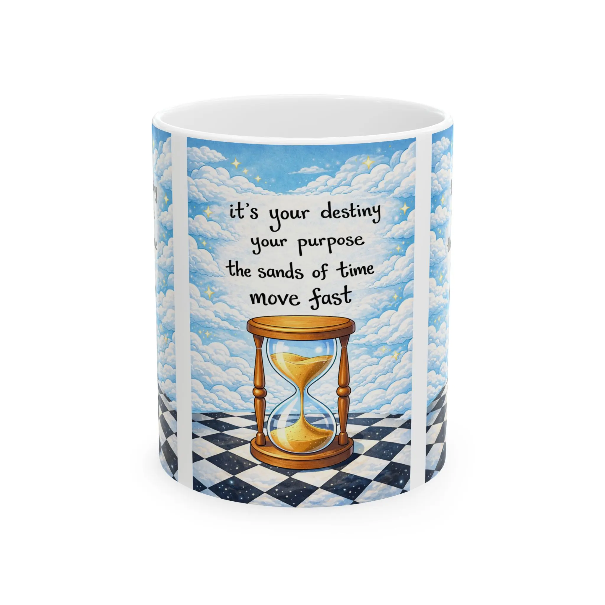 This glossy ceramic mug brings a little surreal calm to morning routines. A hand-illustrated hourglass sits on a checkered floor beneath a sky of swirling clouds, with the soft, hopeful words: “it’s your destiny / your purpose / the sands of time / move fast.” It reads like a quiet nudge—encouragement for writers, dreamers, and creative souls who savor moments of reflection over coffee or tea during writing sessions, late-night planning, or when you need a grounding pause in a busy day.