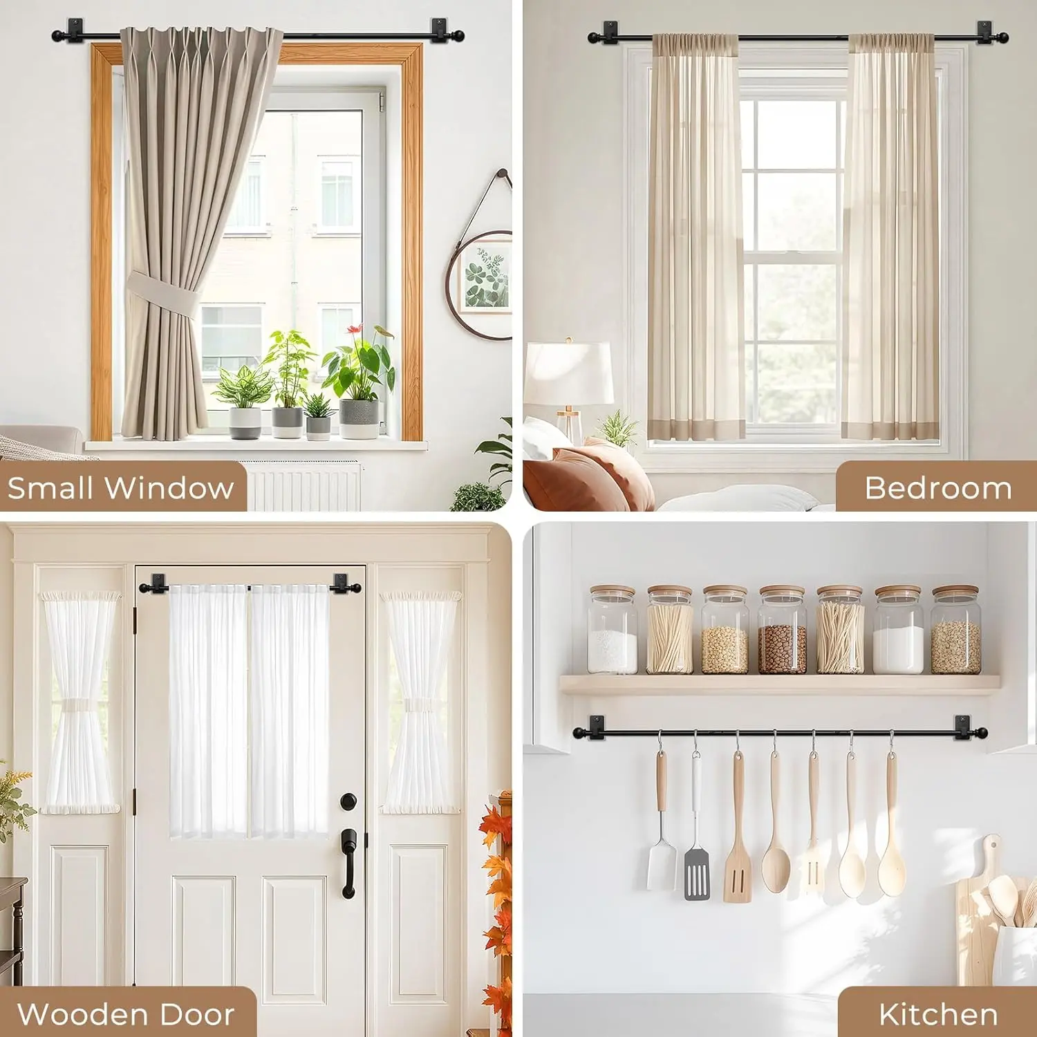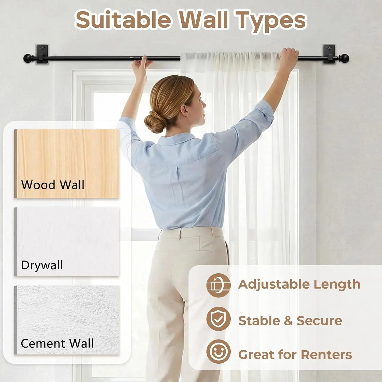 𝐃𝐮𝐚𝐥-𝐋𝐨𝐜𝐤 𝐒𝐲𝐬𝐭𝐞𝐦 𝐁𝐫𝐚𝐜𝐤𝐞𝐭: Solves adhesive failure.Industrial adhesive secures first, then micro-pins lock it.Tested to hold 16 lbs (2 brackets) for 53″/66″ rods, and 20 lbs (3 brackets) for 92″/132″ rods-far more secure than ordinary adhesive rods.𝐑𝐞𝐧𝐭𝐞𝐫-𝐒𝐚𝐟𝐞 & 𝐖𝐚𝐥𝐥-𝐅𝐫𝐢𝐞𝐧𝐝𝐥𝐲: Designed for perfect walls and worry-free living.When removed, the ultra-thin micro-pins leave barely noticeable 1.5mm holes(smaller than a pencil lead) that can be filled in seconds with common household fillers.An ideal minimal-damage choice for renters and anyone who values a spotless home.𝐐𝐮𝐢𝐜𝐤 𝐒𝐞𝐭𝐮𝐩-𝐈𝐧𝐬𝐭𝐚𝐥𝐥𝐬 𝐢𝐧 𝐌𝐢𝐧𝐮𝐭𝐞𝐬: Includes all necessary hardware for a drill-free installation.Just peel and stick the bracket, tap in the security pins, assemble the rod sections, and hang your curtains.Achieve a professional, sturdy mount without any power tools or experience.𝐓𝐞𝐥𝐞𝐬𝐜𝐨𝐩𝐢𝐜 & 𝐀𝐝𝐣𝐮𝐬𝐭𝐚𝐛𝐥𝐞: Features a unique two-stage adjustment system. First, assemble the main frame by connecting the multi-segment rods to your desired length. Then, use the telescoping rod for fine-tuning. This combination offers flexibility and stability, effortlessly fitting a vast range of window sizes.𝐒𝐥𝐞𝐞𝐤 𝐃𝐞𝐬𝐢𝐠𝐧 𝐟𝐨𝐫 𝐄𝐯𝐞𝐫𝐲 𝐑𝐨𝐨𝐦: Crafted with a versatile matte black finish and clean finials to blend seamlessly into your home. Built from robust 0.5mm-thick iron (5/8″ diameter), it delivers lasting stability and daily reliability for any room.