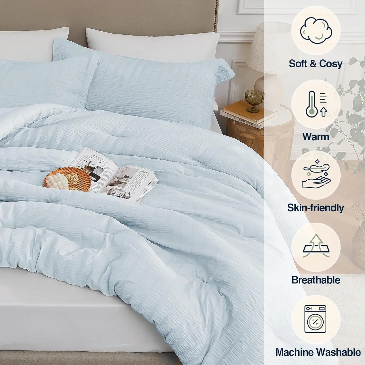 Comfort & Softness: Our comforter set is made of100% washed polyestermaterial which is soft, comfortable and durable.With a perfect balance of weight and warmth, this comforter is breathable and skin-friendly without weighing down your body.Let you relax in a cloud-like touch and throw the day's fatigue into sweet dreams.Easy Care & Pet Friendly: The seersucker comforter is secured with stitching to ensure that the inner filling will not shift, providing long-lasting warmth.This bedding set supports machine washing, no shrinkage, no distortion, convenient for you to maintain a clean sleeping environment.Soft and durable pet-friendly material is not easy to absorb pet hair and easy to clean.Universal for All Seasons: This bed set features versatility for all seasons.With different sizes and colour combinations to choose from, you can match them according to your personal preference and home style.Light spring & summer colors to dark autumn & winter colors, to meet your needs in different seasons and occasions, add a splash of color to your bedroom.Innovative Designs: This micro-pleated design seersucker quilt has a great texture, creating a vivid three-dimensional wave pattern visual effect.Compared with other traditional comforters, this fabric adds design highlights, non-iron easy to care for, saving a lot of time for de-wrinkling.Add a unique romance and elegance to your room.What You Can Get: Twin comforter set includes 1 comforter (68''x90''), 1 pillowcases (20''x26''). The bedding sets come in a vacuum-sealed package, and we recommend wash comforter gently and tumble dry on a low temperature before first use, or gently patting it to fluff up the comforter again. If you have any questions please feel free to contact us.