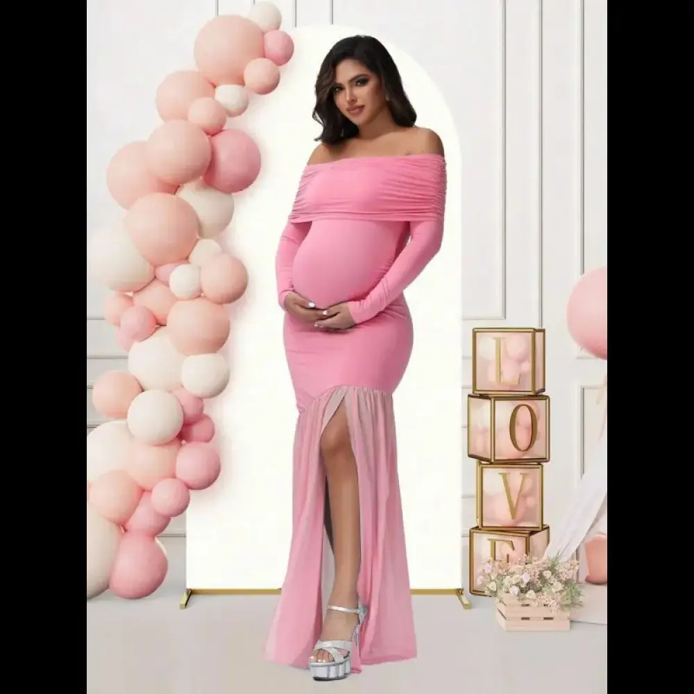 2026 Maternity Off-Shoulder Long Sleeve Dress with Mesh Patchwork and Side Slit - Stretchy Slim Fit Mermaid Long Dress Suitable for Baby Showers, Photoshoots, Weddings Elegant Solid Color Maternity Wear Can be used with raincoat