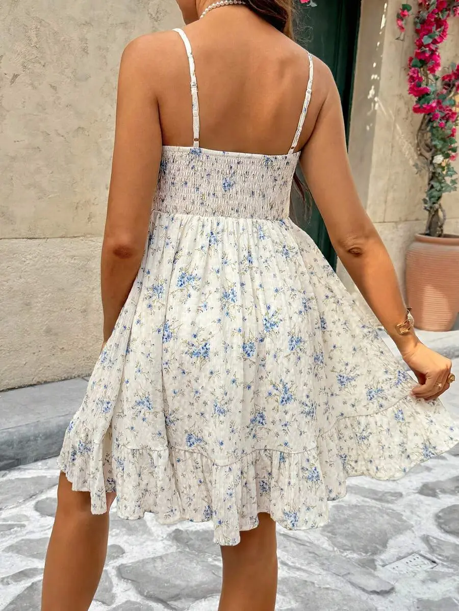 DOKOTOO Women's Boho Floral Smocked Empire Waist Square Neck Long Sleeve Button Beach Maxi Dress Sundress Brown Viscose Fitted Flowy Ruffle Hem