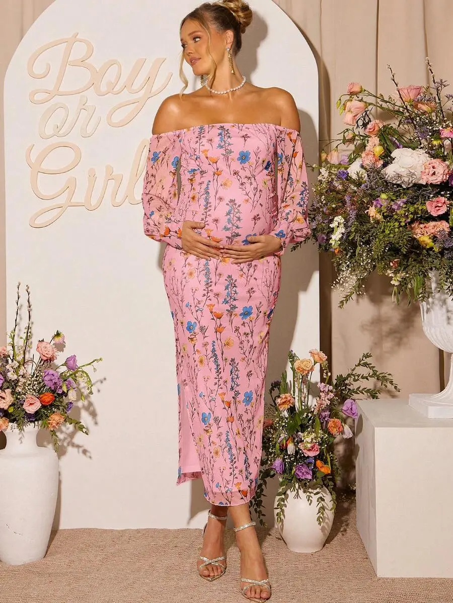 MaterniRIO Floral Print Maternity Off-Shoulder Fitted Long Sleeve Dress